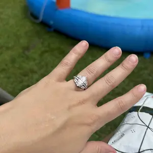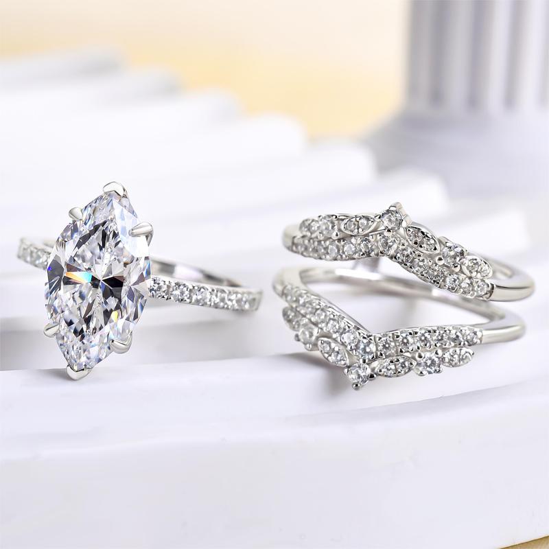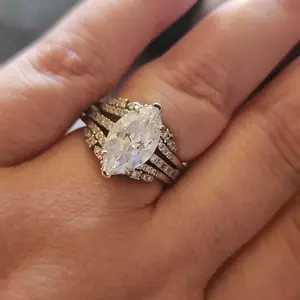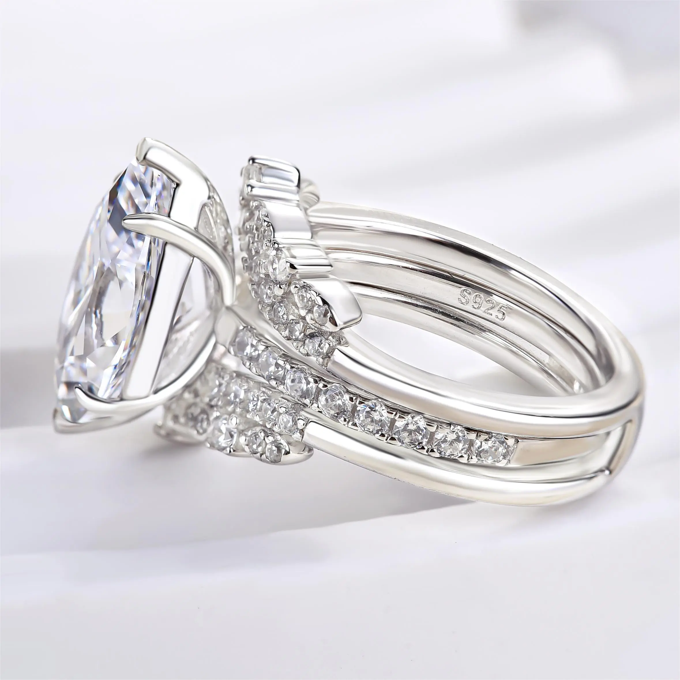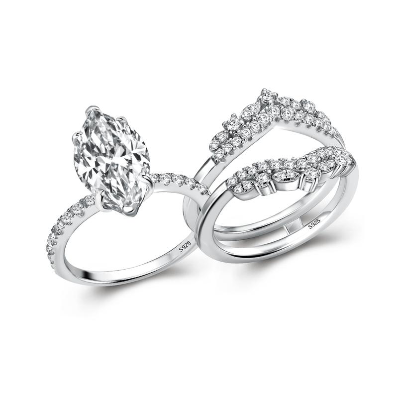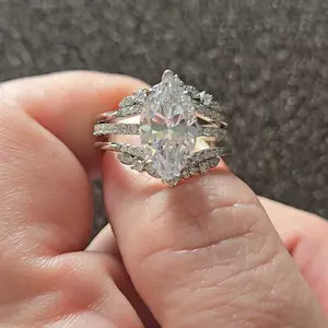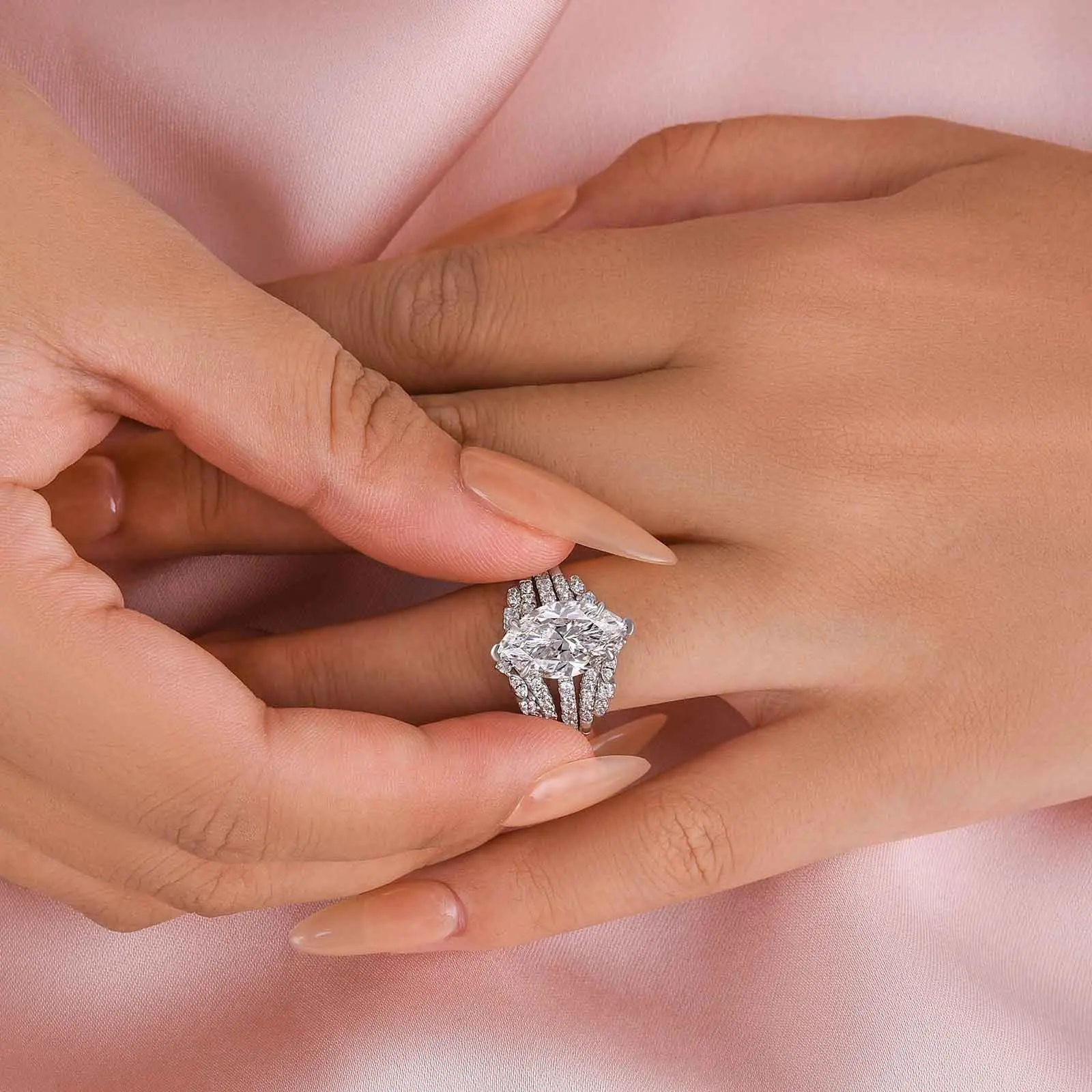 Beautiful but center stone is way too big. I love the shape but couldn’t get it in a smaller size. Looks fake.