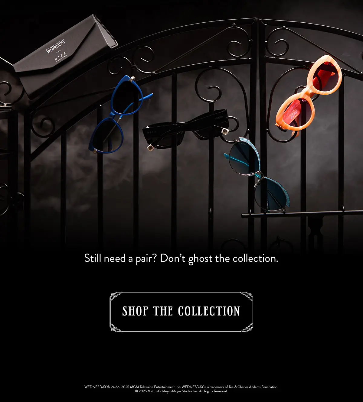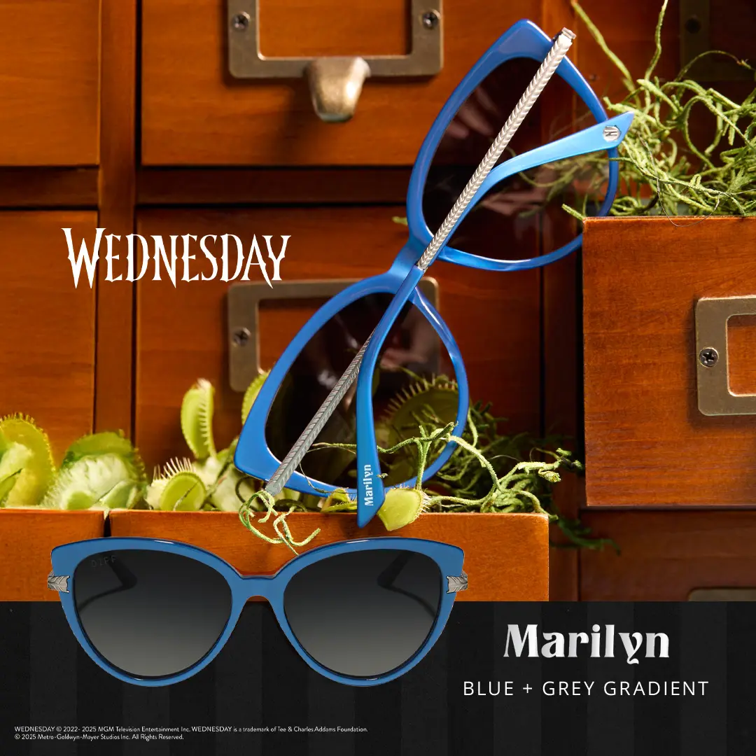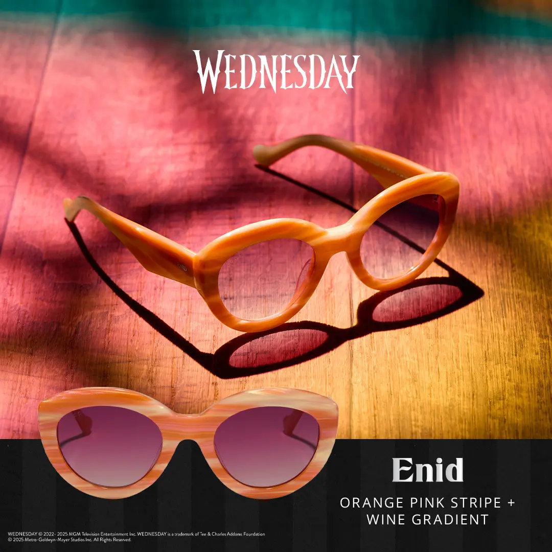 This hauntingly chic collab brings your favorite Wednesday characters to life through bold shapes, unexpected details, and supernatural-level style. With exclusive touches like the Nevermore Academy crest and quote engravings, these sunnies are the perfect way to stand out in true Wednesday fashion.