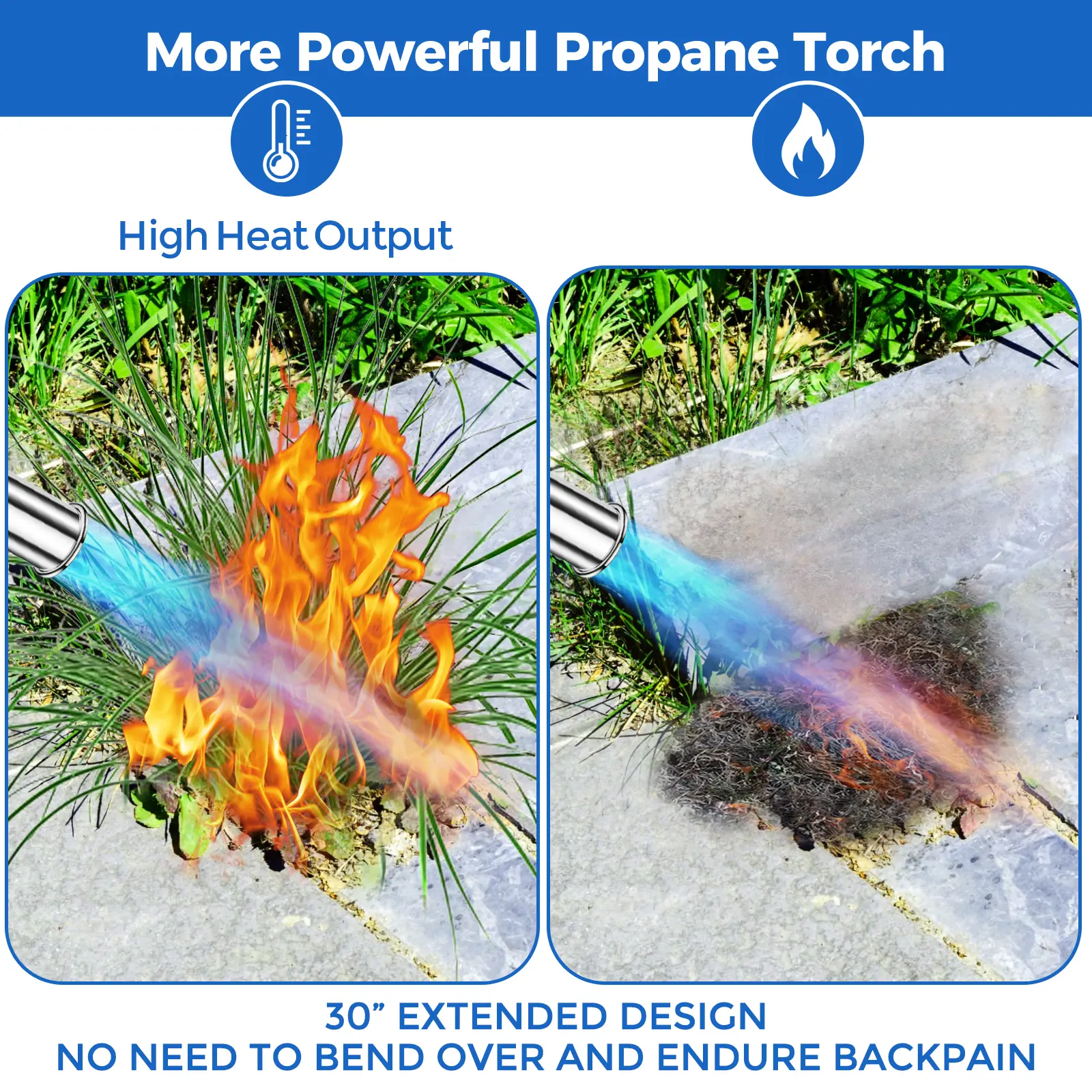 ăPowerful Weed BlowtorchăOur propane torch head is made of fire-resistant steel, sprays a high-intensity blue flame, and can easily heat up to 3600 degrees F. The foldable design of the blowtorch will also bring you great convenience.