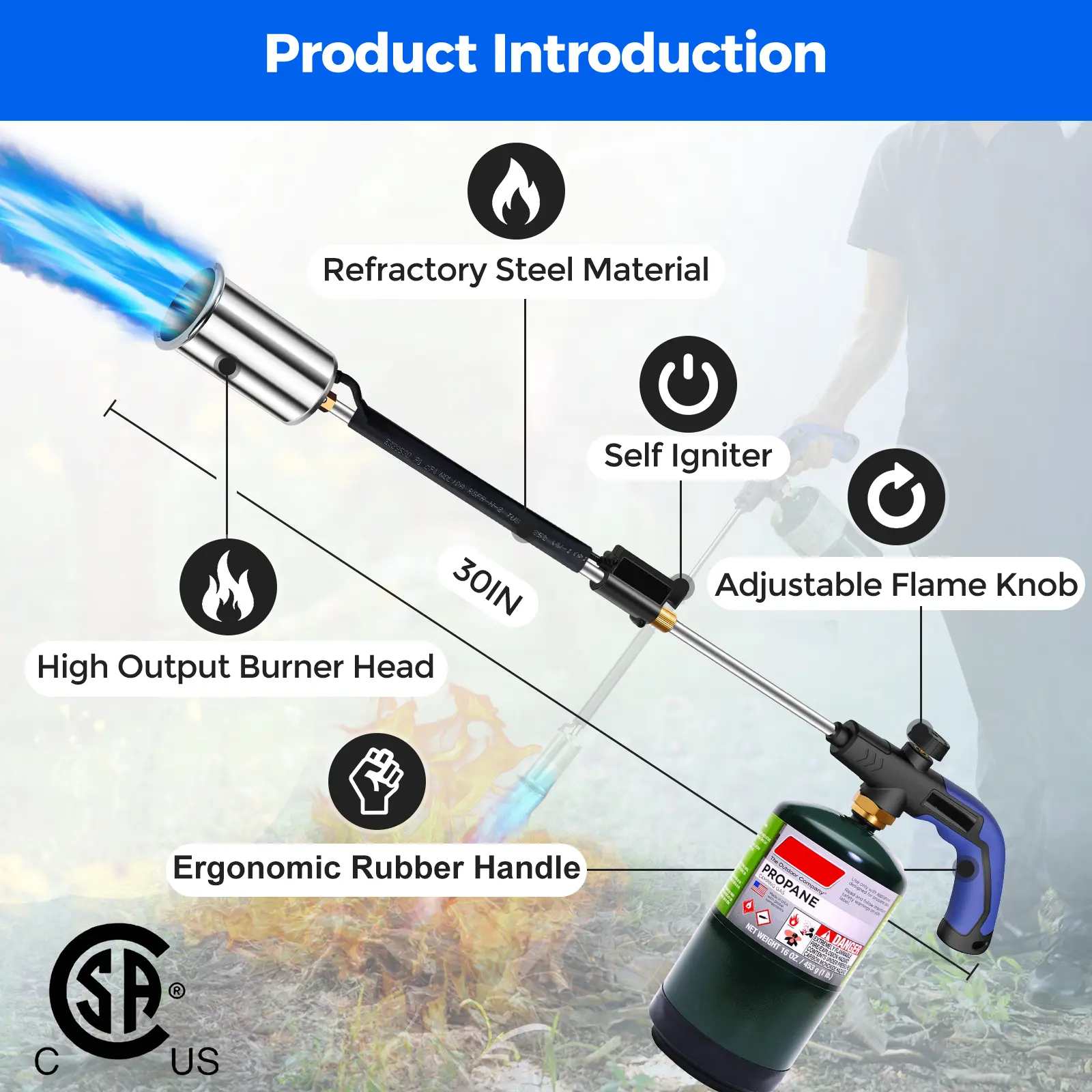 ăDurable and ComfortableăThe 30-inch long handle of the weed blowtorch is ergonomically designed, and the connector is made of brass, which can be tightly connected to the gas cylinder (propane not included), making your use safe and comfortable.