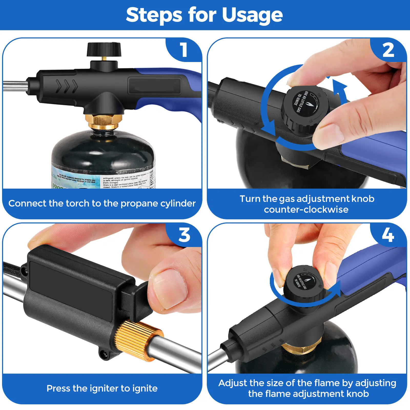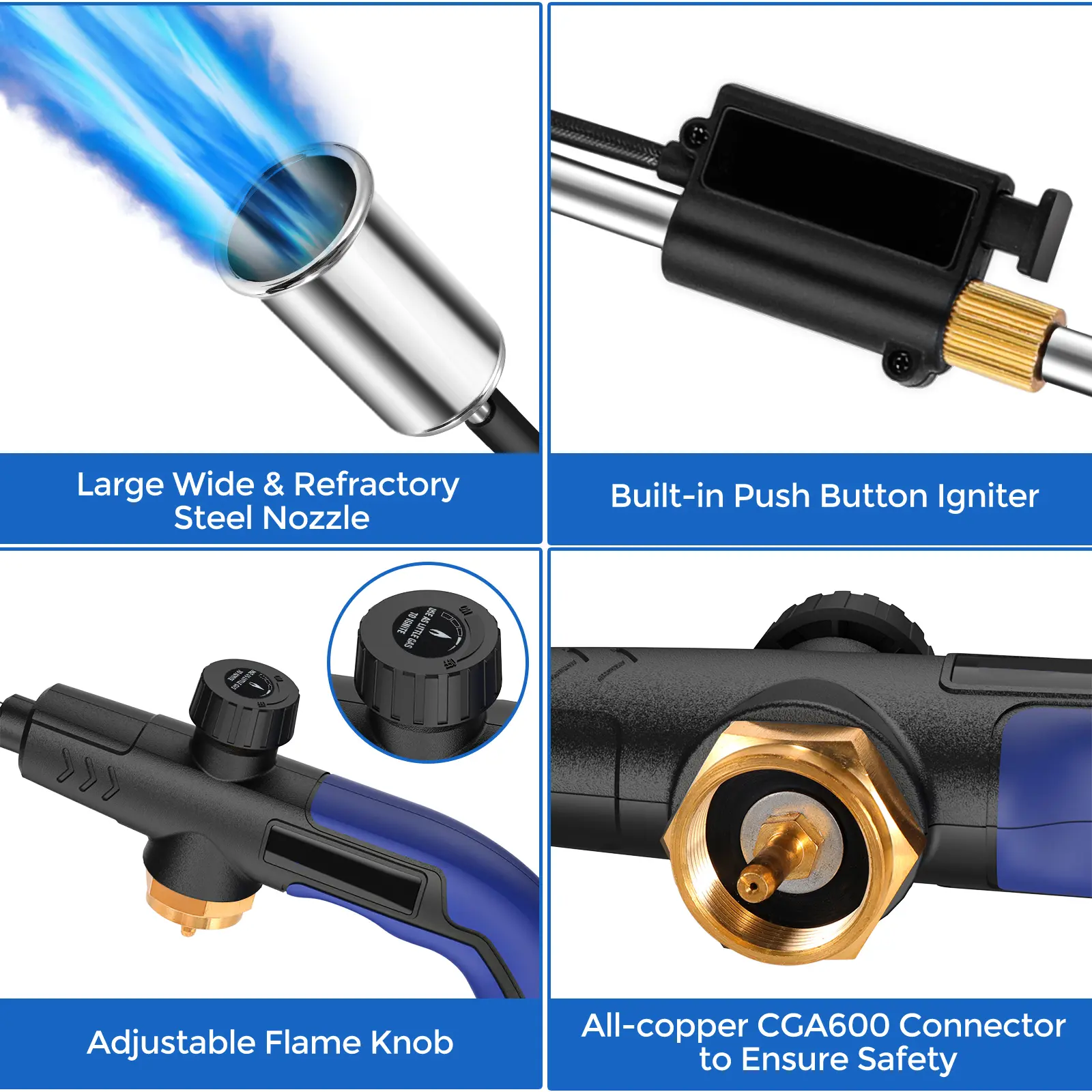 ăExcellent Ignition and Flame ControlăOur propane blowtorch is equipped with an excellent ignition mechanism and gas control valve, which can help you light the flame quickly and safely and adjust the flame size easily.