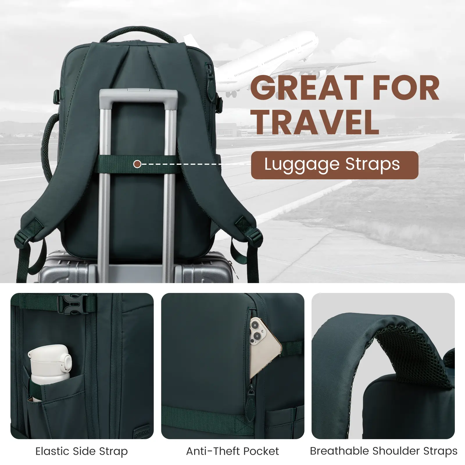 The luggage strap design on the back can relieve the pressure on your shoulders and back, freeing your hands, and the elastic side pockets can store water bottles or umbrellas for convenient travel