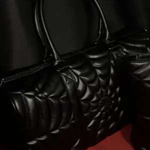 This matte faux leather weekender duffel bag has a black stitched spiderweb design all over.