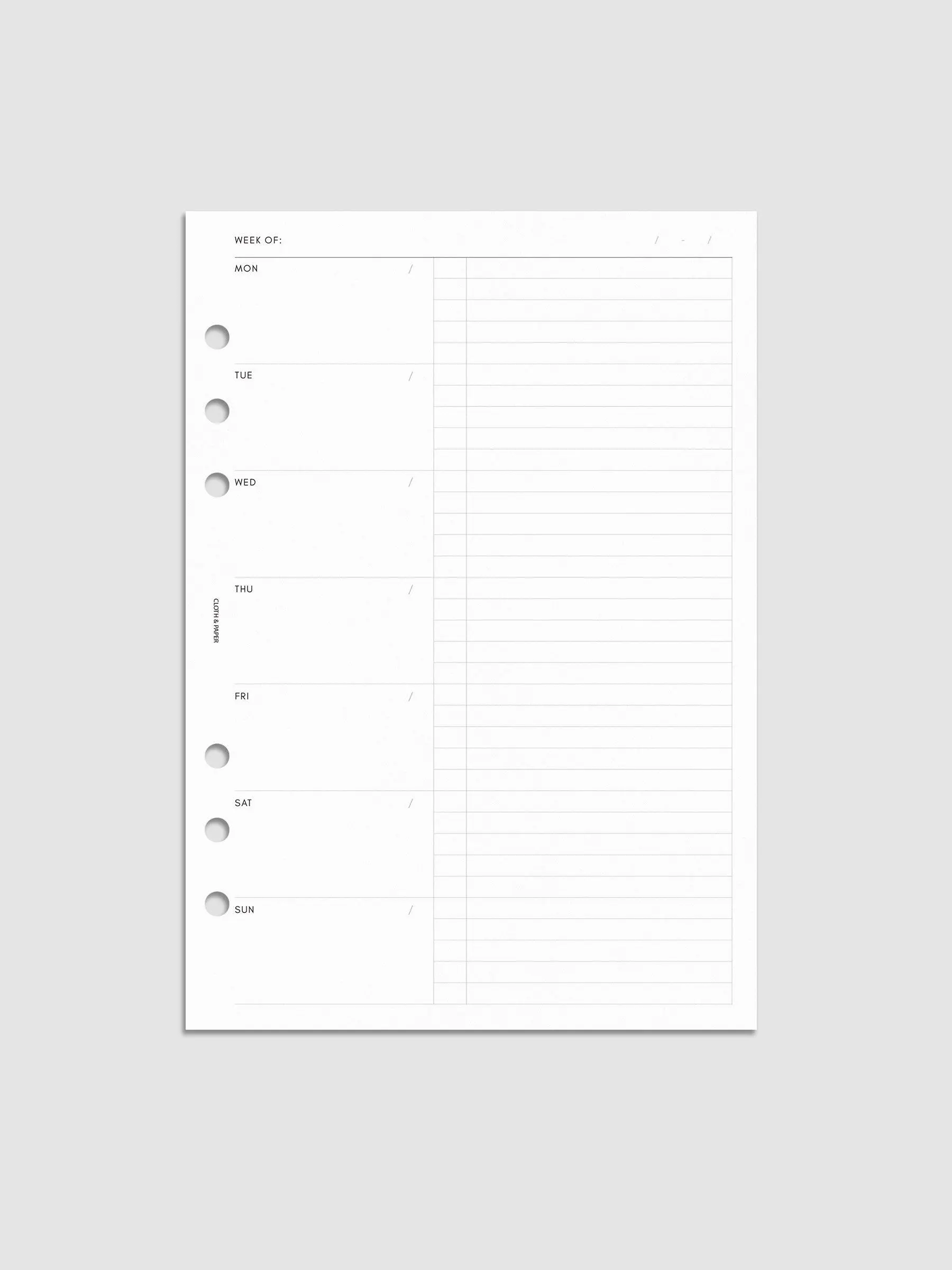 The left column lists the days of the week in a Monday start format, with open space to personalize each day and check off completed items. A task-style column on the right provides a dedicated area to track projects, work tasks, or running lists. Unlabeled and undated, this flexible layout adapts seamlessly to personal planning, work planning, or a combination of both.