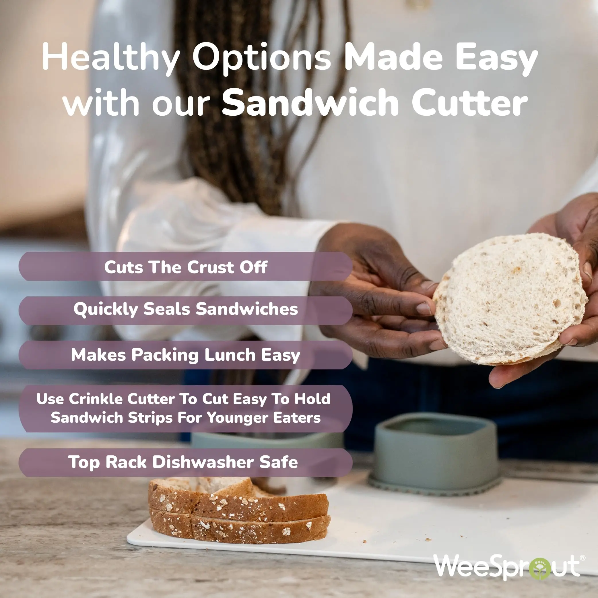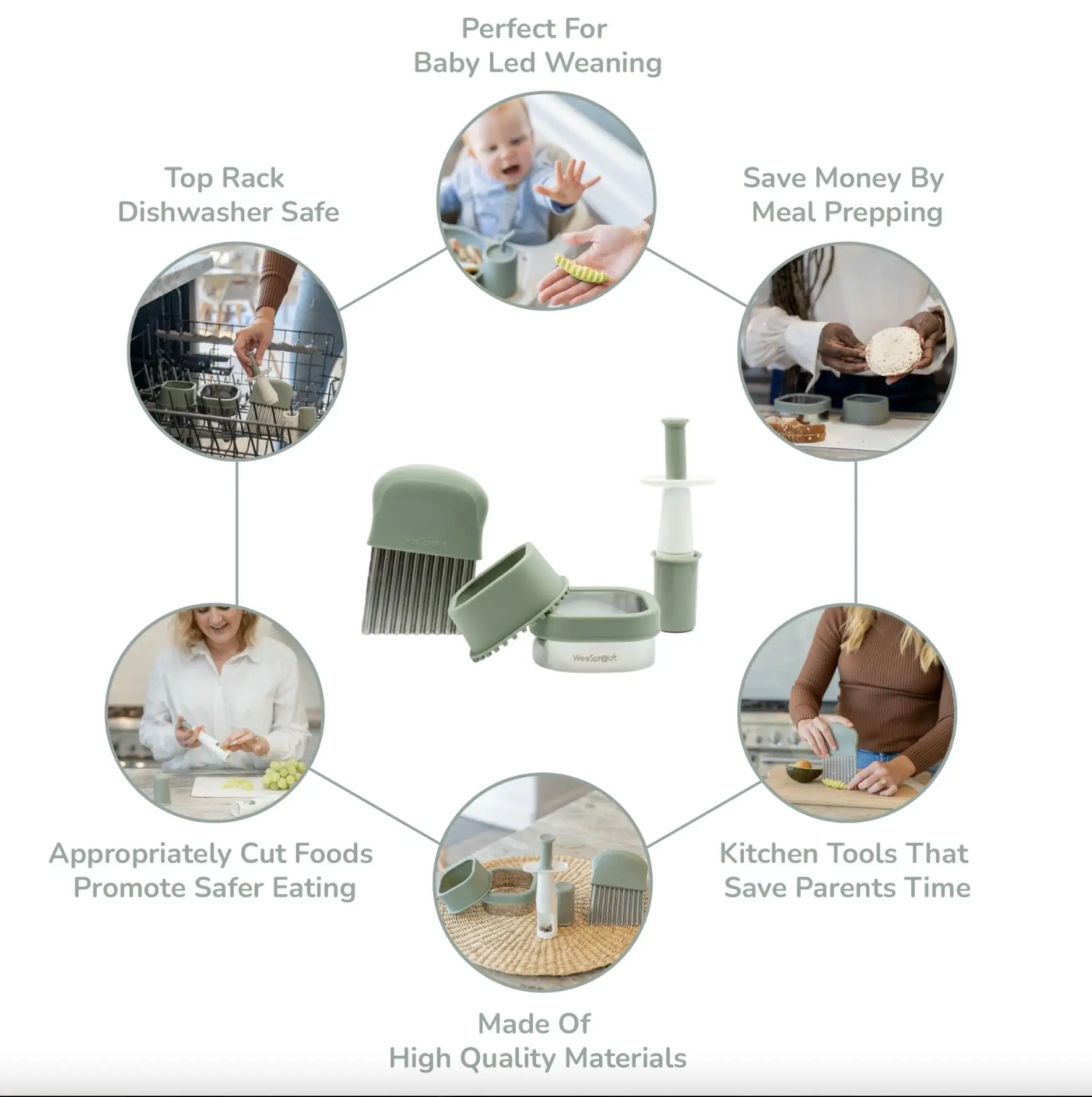 The WeeSprout baby led weaning set was designed in collaboration with a feeding specialist to make baby led weaning quick, easy, and above all – SAFE! This three piece baby feeding set includes a crinkle cutter, grape cutter, and a sandwich cutter to simplify the baby led weaning process.