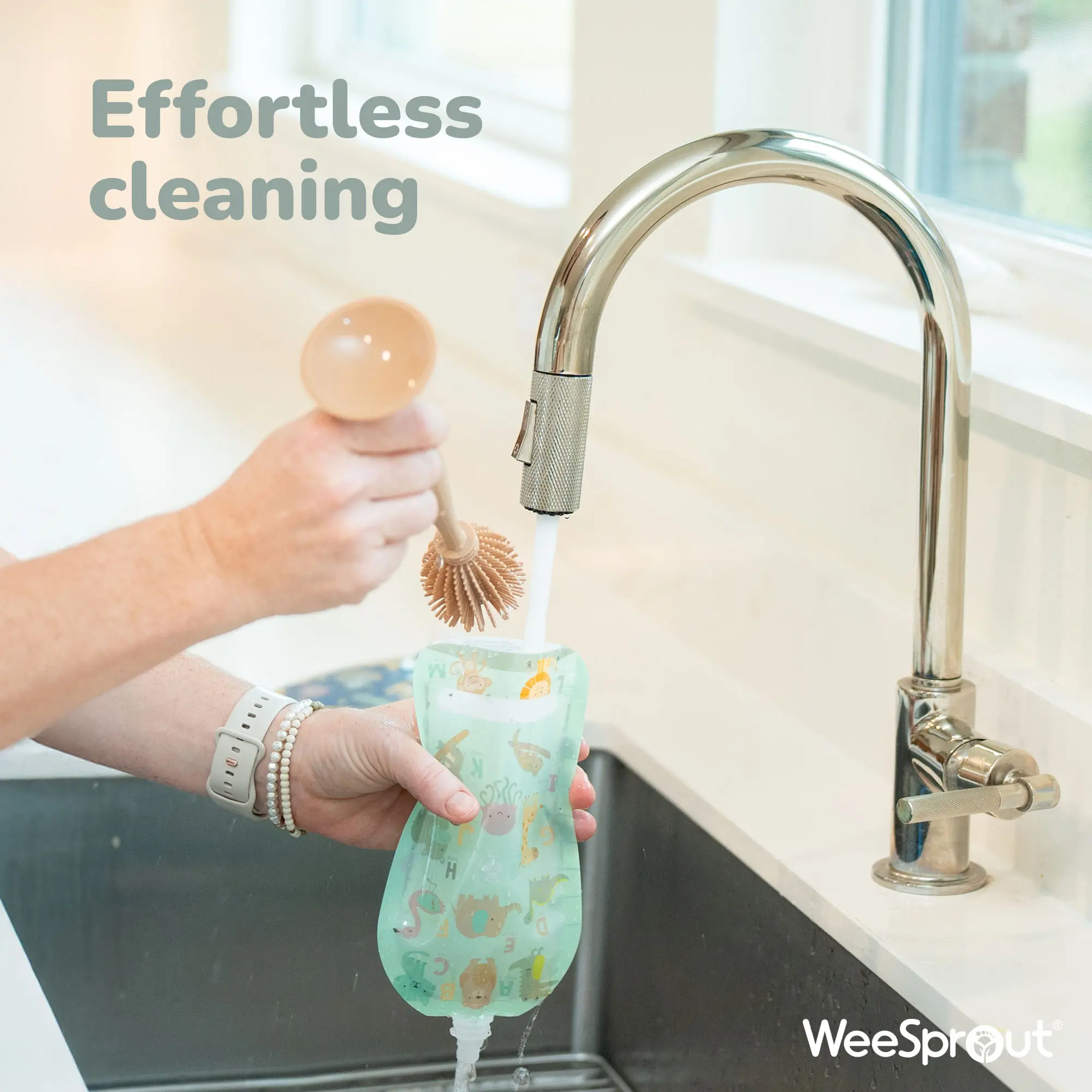 ·Extra wide zipper-opening makes filling and cleaning easy. When cleaning, water flows through the zipper opening and out the spout. There are no pesky corners to trap food.