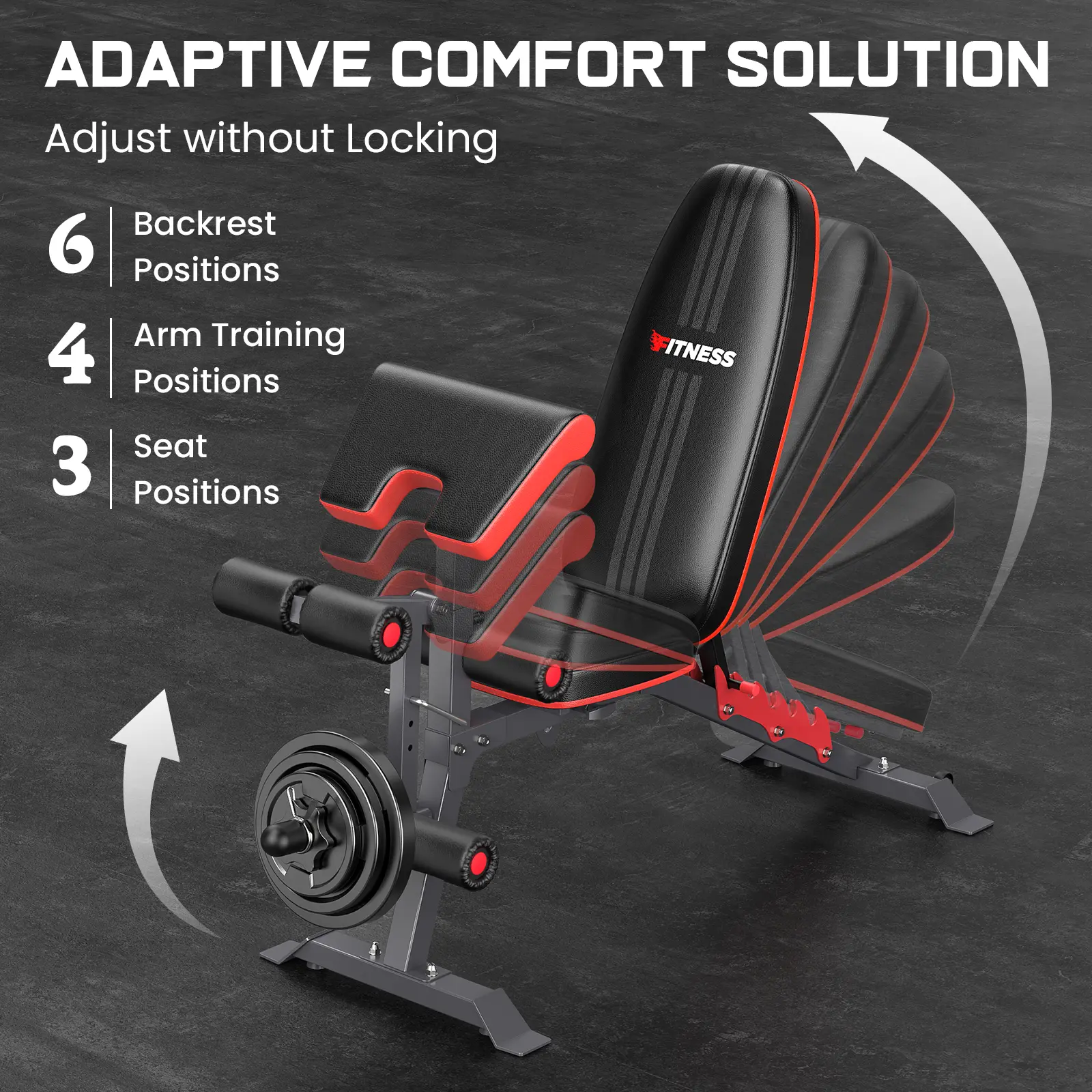 𝙁𝙐𝙇𝙇𝙔 𝘼𝘿𝙅𝙐𝙎𝙏𝘼𝘽𝙇𝙀 𝘼𝙉𝘿 𝙑𝙀𝙍𝙎𝘼𝙏𝙄𝙇𝙀: Featuring 6 backrest positions, 4 arm training positions, 3 seat positions, and 3 leg curl positions, this adjustable bench offers endless workout possibilities. Easily switch between exercises like seated dumbbell presses, flat bench presses, and decline sit-ups.