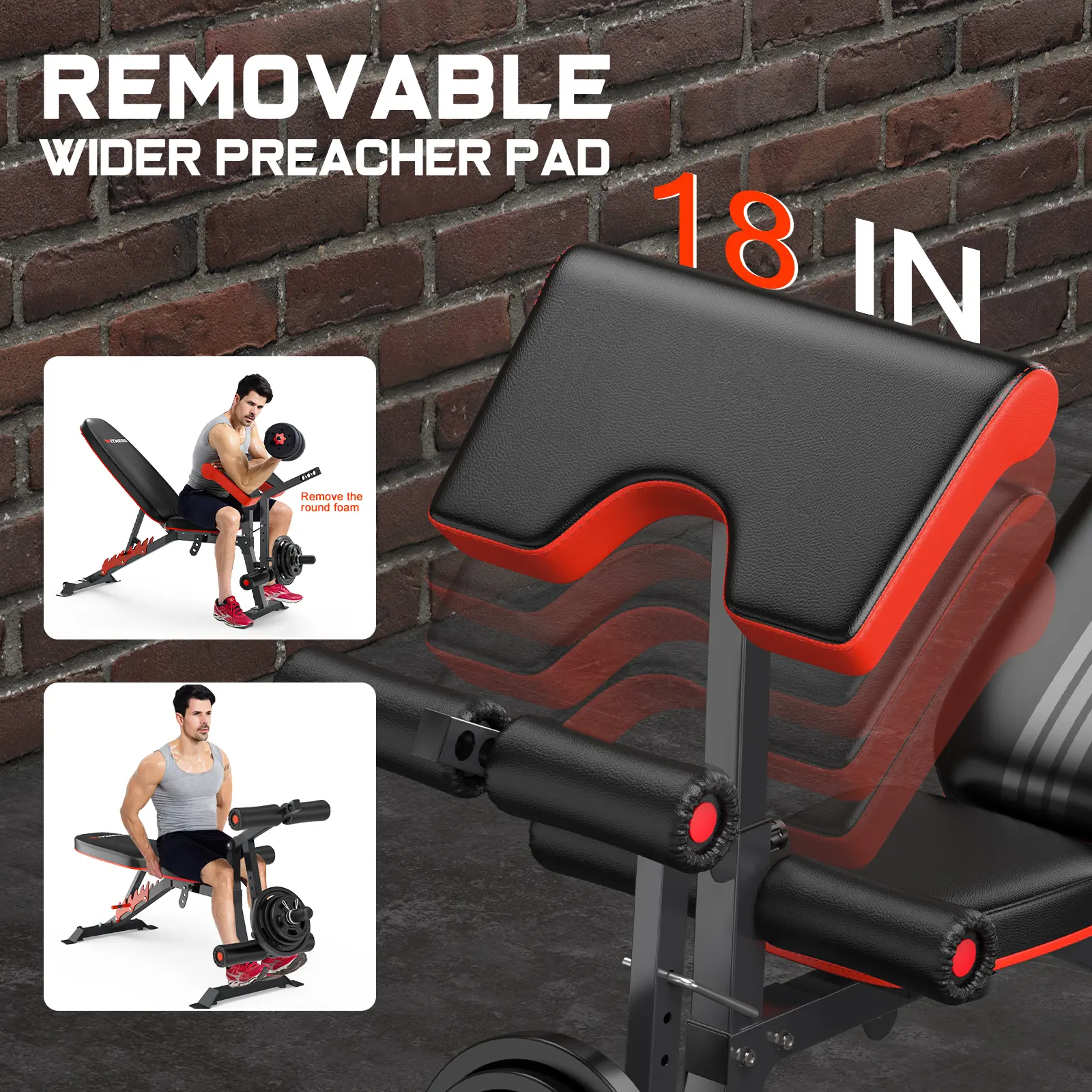 Heavy Duty Weight Bench for Home Gym with 18" widened preacher pad and leg curl.