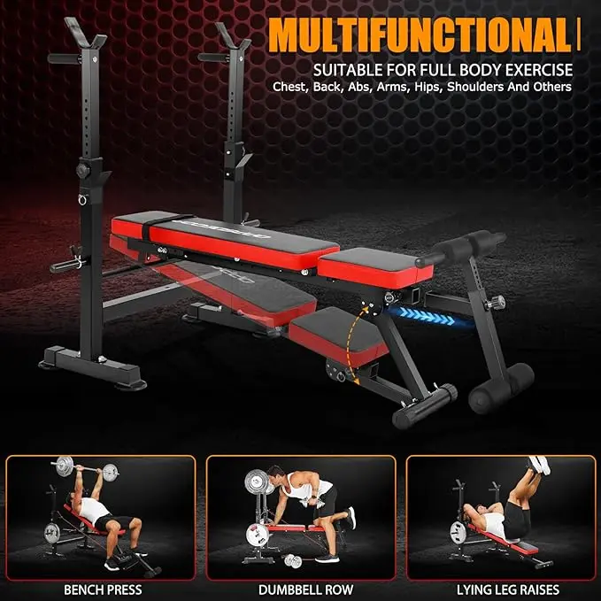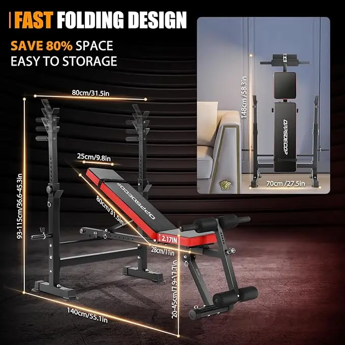 ·【All-in-one and Simple】The OPPSDECOR multifunctional workout bench is not only a weight bench, but also a bench press rack, a sit up bench, a barbell racks and a squat rack, for Flat/Incline/Decline Bench Press, Dumbbell Flies, Curl-ups, Squats, Push-ups, Sit Up etc.. Ideal for simple and functional lightweight daily home workout or high-intensity strength training.