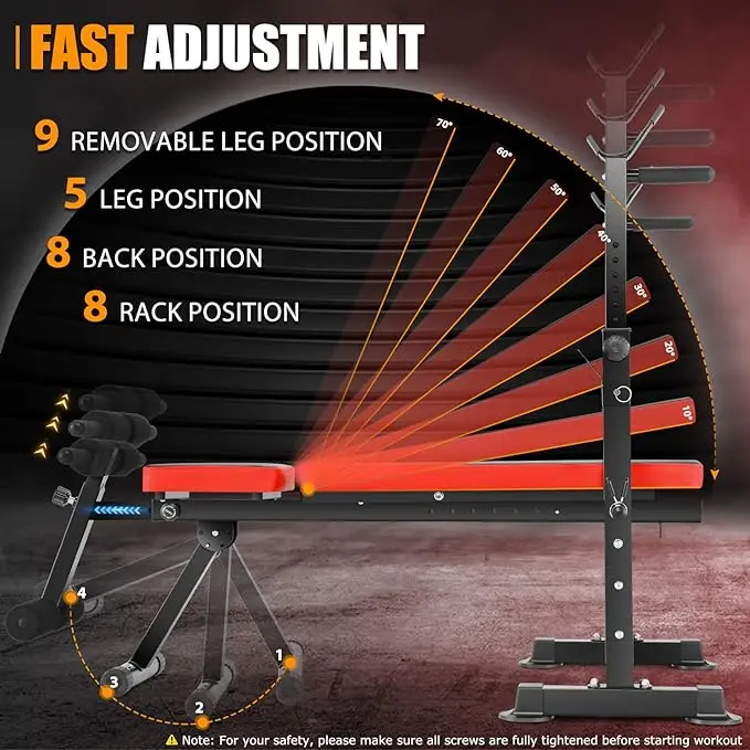 ·【Multi-position Fast Adjustable】OPPSDECOR weight bench has multiple adjustable positions, perfect for people of all stages, 8 barbell rack position, 8 back pad position, 5 leg position, 4 removable leg position. Great upright bench, incline bench, flat bench and decline bench for working out chest, back, abs, arms, hips, shoulders and more Muscle groups to help you get an effective workout.