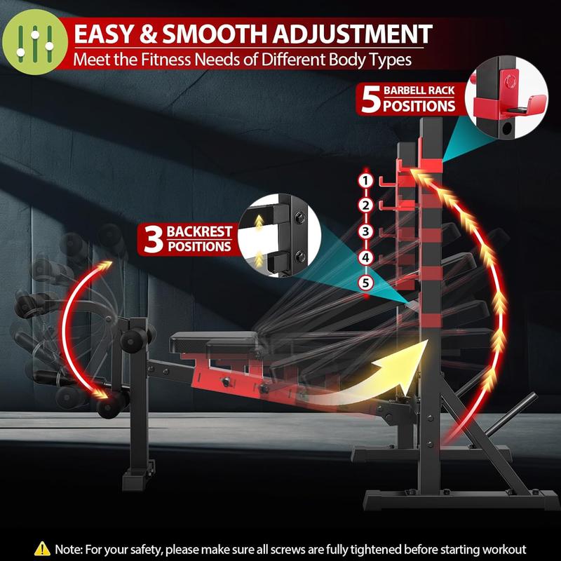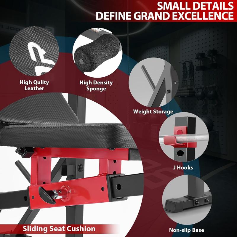 ·【Multi-Angle Adjustable】This workout bench features a 3-position backrest (flat, incline, and decline), two 5-height adjustable J-hook, and a 5-position sliding seat, allowing up to 15 different angles (-10°to 70°) to suit various training needs.It ensures precise body alignment during intense workouts and enables quick and easy adjustment of the barbell height according to your height and exercise routine.