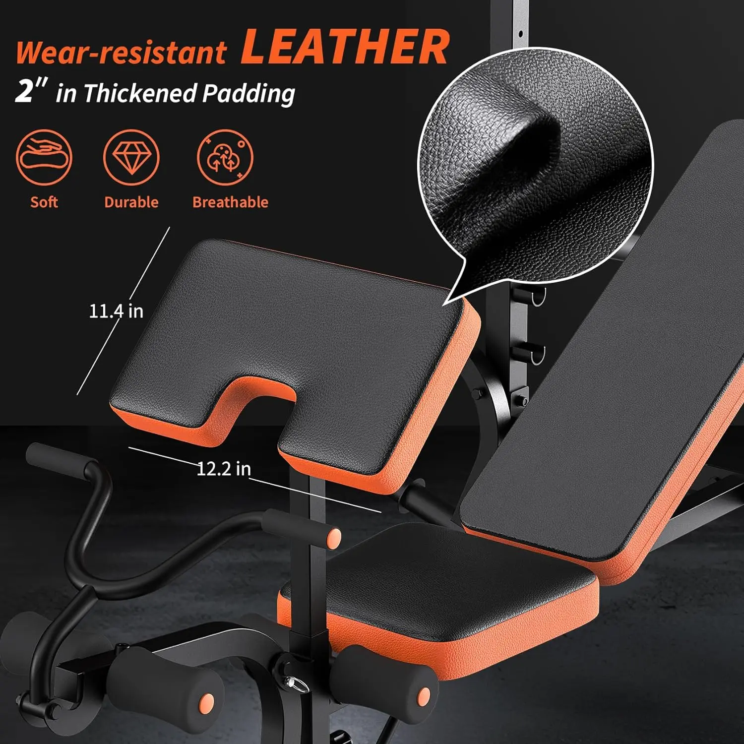 【All-in-One&Dual-function Leg Developer】Includes a weight bench, barbell rack, preacher curl pad, butterfly arms, leg developer, arm curl rack. Adjustable bench with leg extension/curl for lower body workouts; lock leg developer for core exercises.