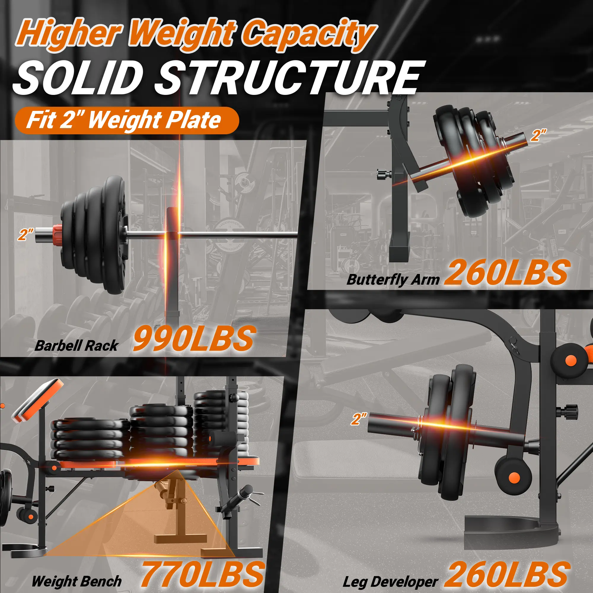 【Impressive Weight Capacity】Olympic bench holds 660lbs, barbell rack up to 990 lbs, butterfly arm & preacher curl pad each 260lbs.