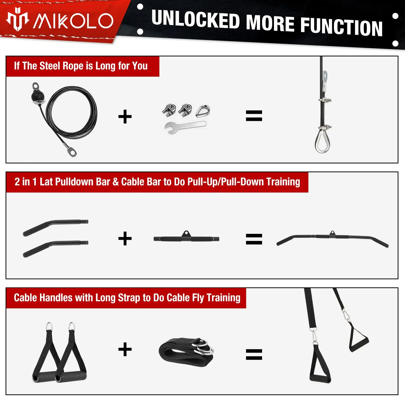 ·[Easy to Assemble and Versatile] Mikolo Upgraded cable pulley system set with hanging straps and carrying bag is effortless to assemble and portable, making it easy to set up in your home gym, garage, training studios, or any place where the strap can be installed. The LAT and Lift Pulley System can connect to power racks, squat racks, pull-up bars, beams, and any other compatible surfaces, providing great versatility for your workout routine.