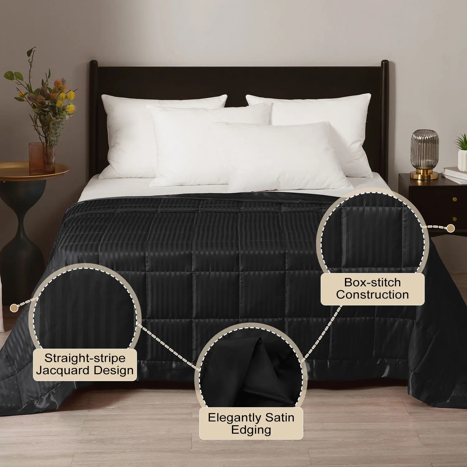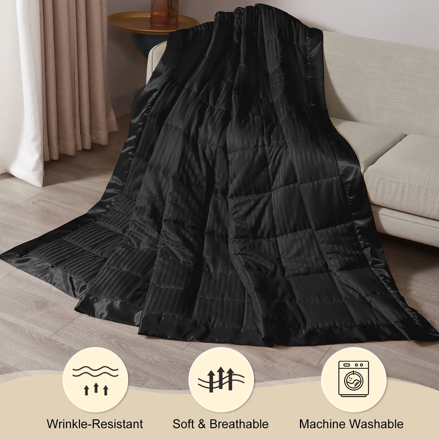The blanket features a straight stripe jacquard design with 3-inch satin binding. It breathes new life into your room while ensuring comfort. A must-have for cozy nights.