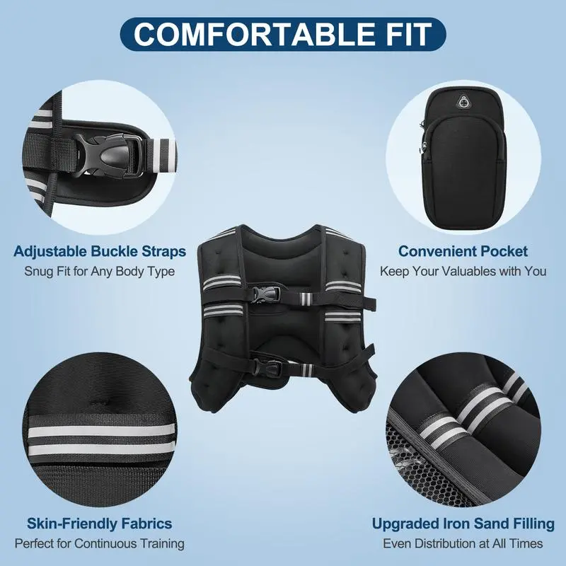 The weight vest for men is easy to put on and take off, with a simple clip system that allows you to adjust the fit quickly. Reflective straps will allow you be seen during night workout. Mesh pocket of the weight vest women will come super handy for small items such as keys or phone.