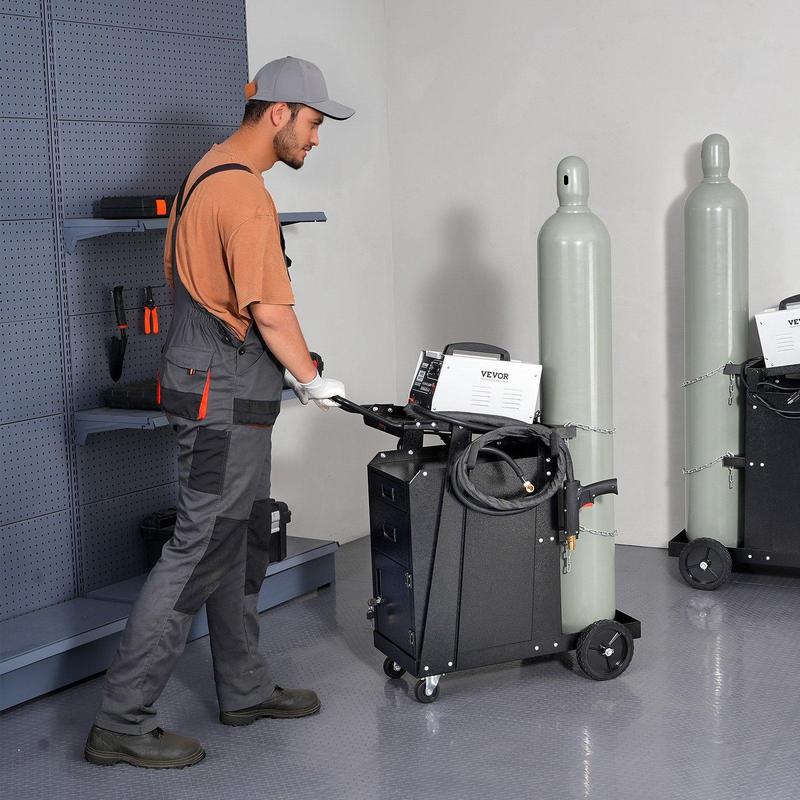 ·Spacious Storage Space: Our MIG welder cart is equipped with a spacious open-top shelf, 2 drawers, an anti-theft lockable cabinet, and 4 multi-functional brackets, providing ample and flexible storage space. It effortlessly accommodates various welding machine and tools, enhancing your work efficiency and maintaining a tidy and efficient workspace.