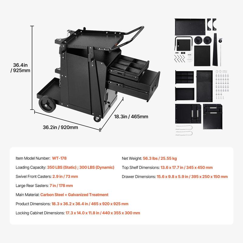 ·Durable Construction: This heavy-duty rolling welding cart is constructed with 1.0mm thickened steel plate that offers exceptional strength and withstands heavy-duty use, resistant to oxidation and deformation. Upper Tray Size: 13.6 x 17.7 in, Drawer Size: 15.6 x 9.8 x 5.9 in, Lockable Cabinet Size: 17.3 x 14.0 x 11.8 in, Whole Cart Size: 18.3 x 36.2 x 36.4 in.
