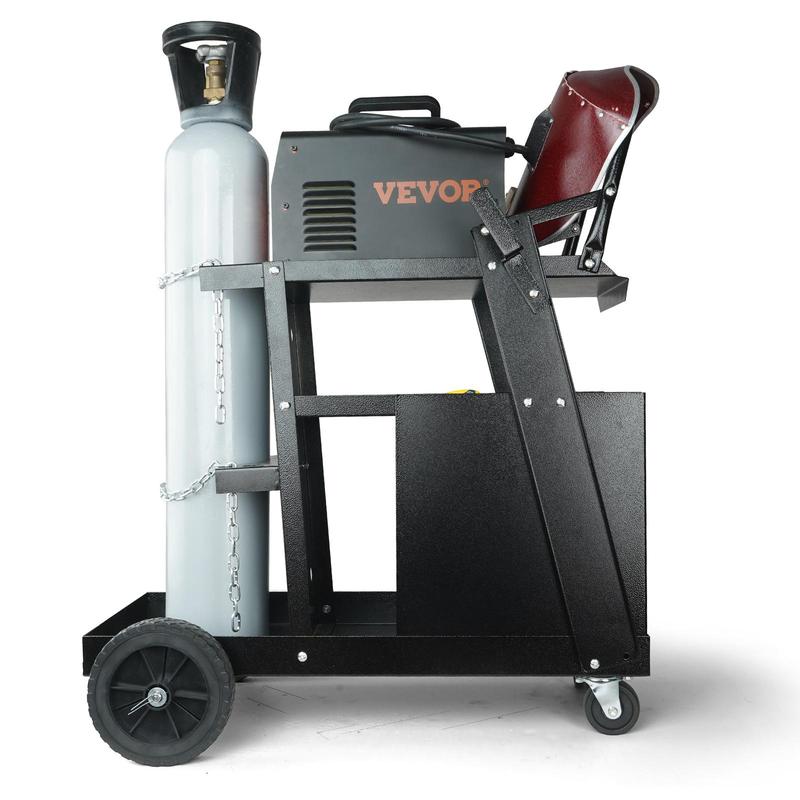 • Your Excellent Storage Assistant: Large 2-tier MIG welder cart can effortlessly accommodate welding caps, welding machines, gas cylinders, welding guns, tools, and more, with 4 practical drawers for neat and organized storage of your items. 2 multi-functional brackets on the sides can hold welding guns, welding pliers, and other tools. Keep your welding tool within arm's reach and well tidy your space with VEVOR.