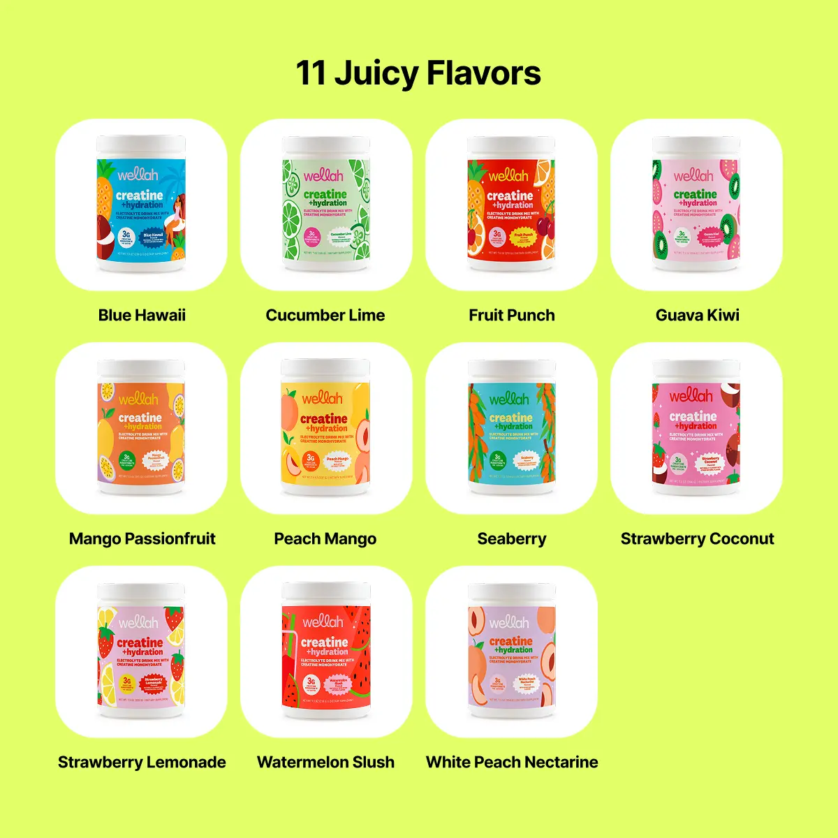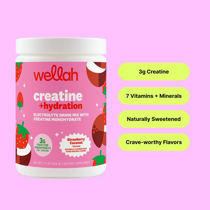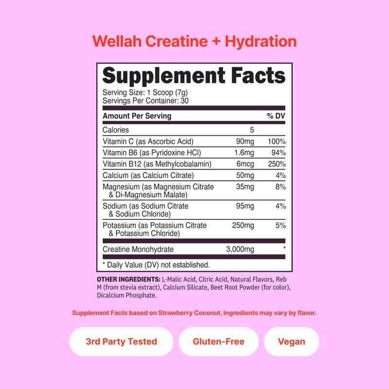 Wellah Creatine + Hydration is designed for anyone who wants smarter, simplified wellness—combining 3 g of strength-boosting creatine monohydrate with four essential electrolytes (potassium, sodium, magnesium, calcium) and B vitamins to keep energy high, muscles happy, and hydration on point—without the salty aftertaste.