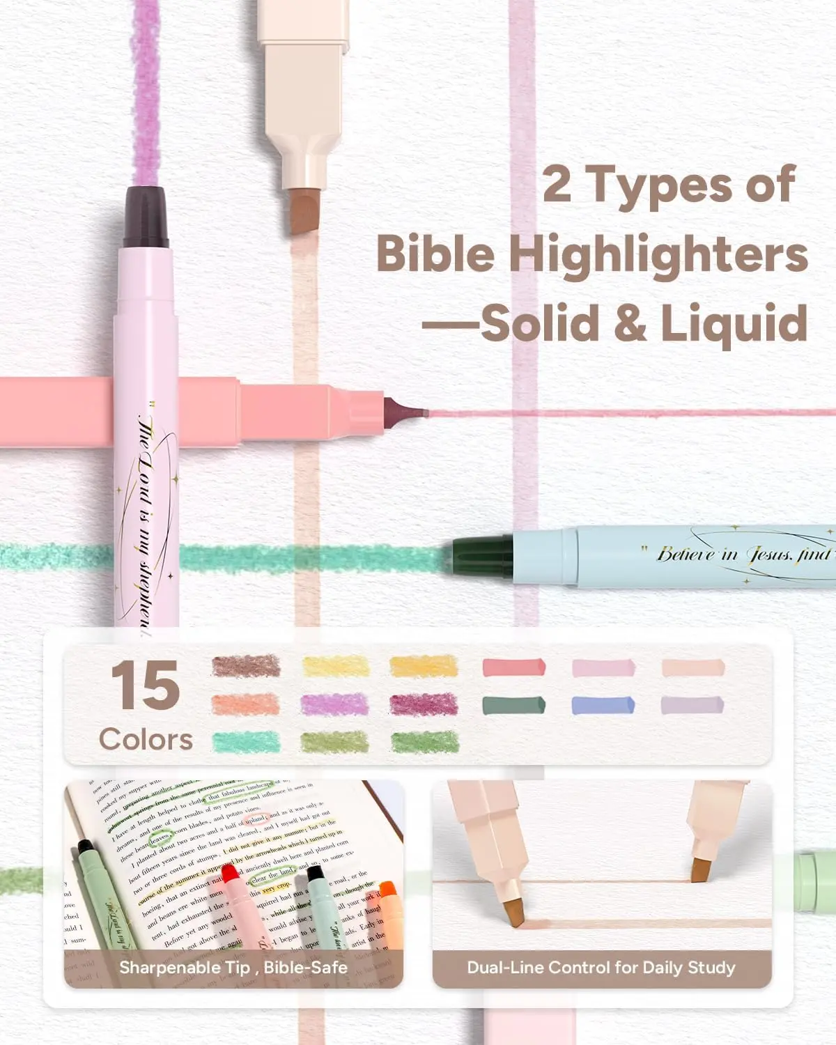 ✔️ 15 No-Bleed Gel Highlighters: Pastel colors; guaranteed no ink bleed-through on thin Bible pages.