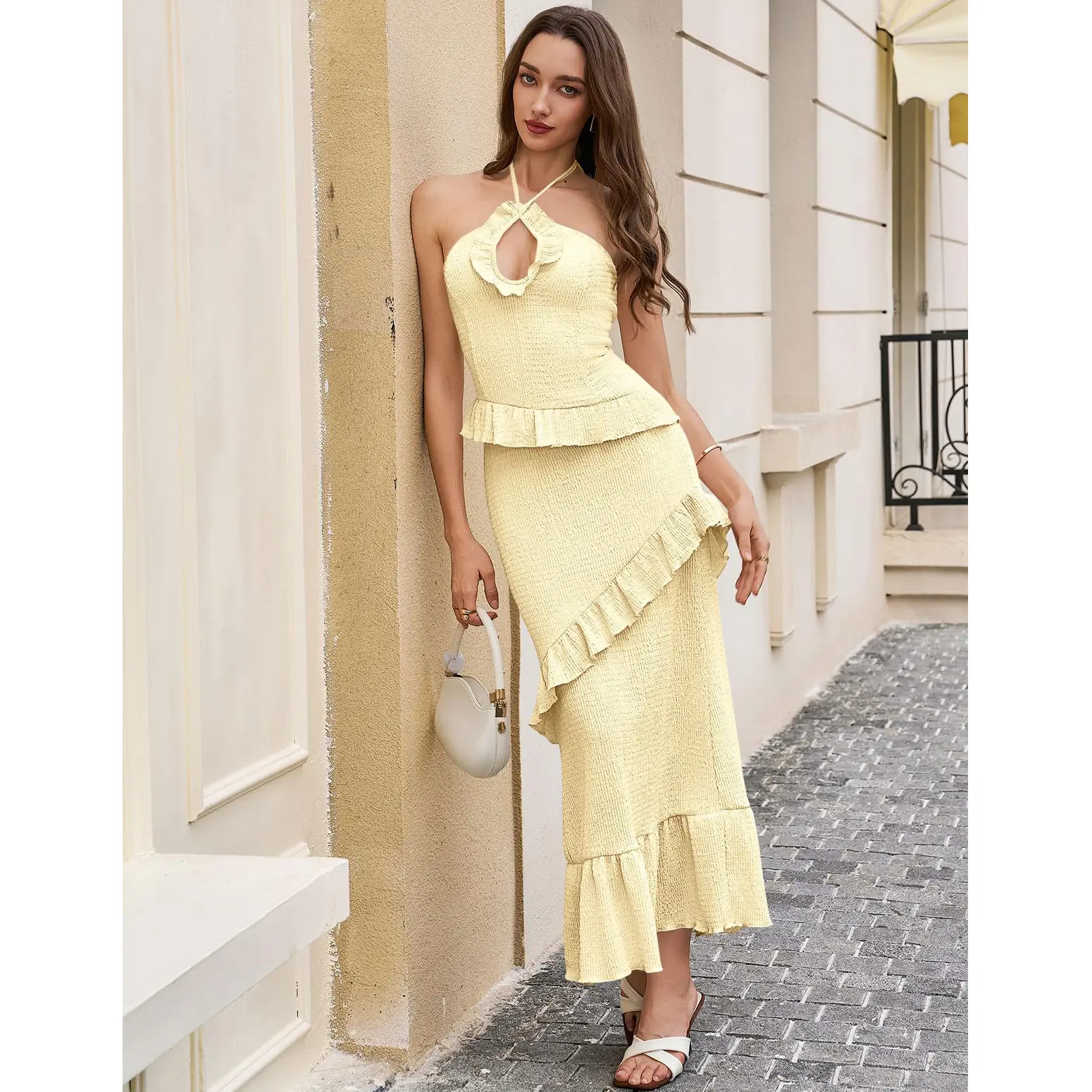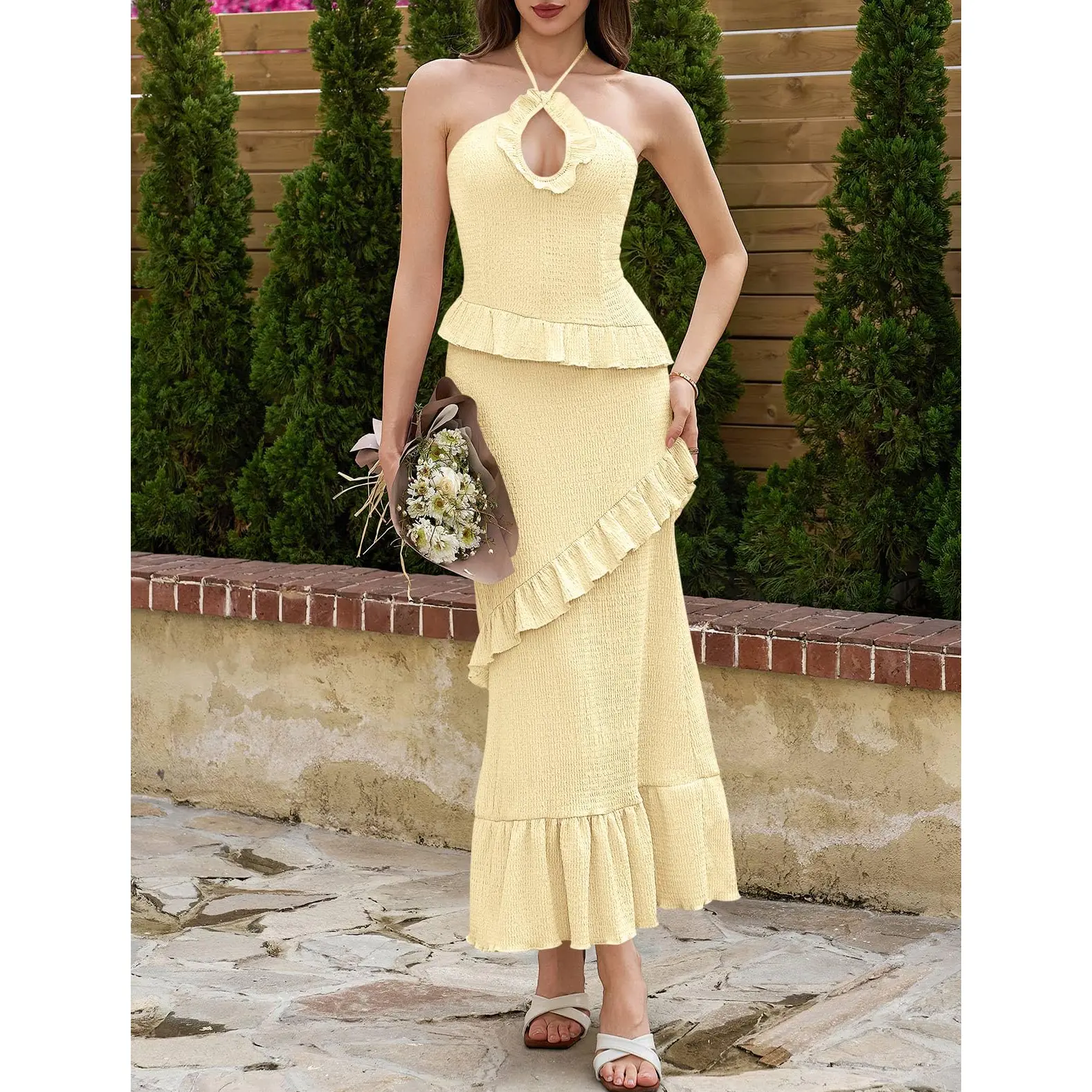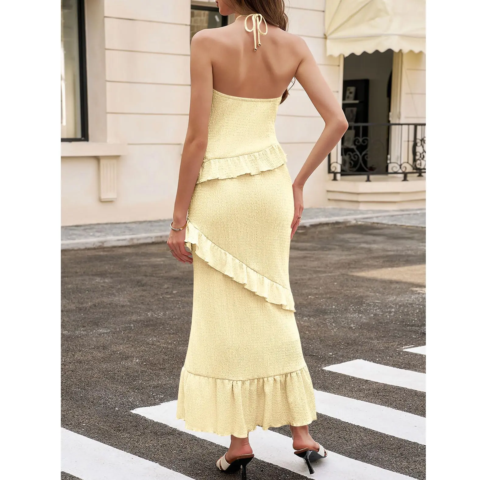 Our summer maxi dress features a halter cut that accentuates the shoulder and neckline. It showcases elegant collarbones, adding sophistication and femininity. This design elevates the overall look, blending elegance with femininity.