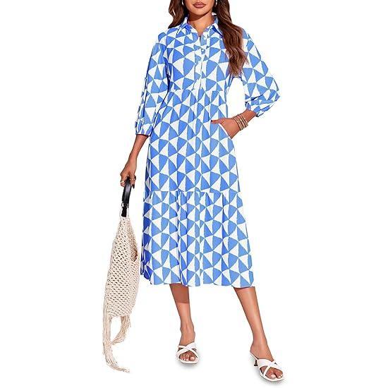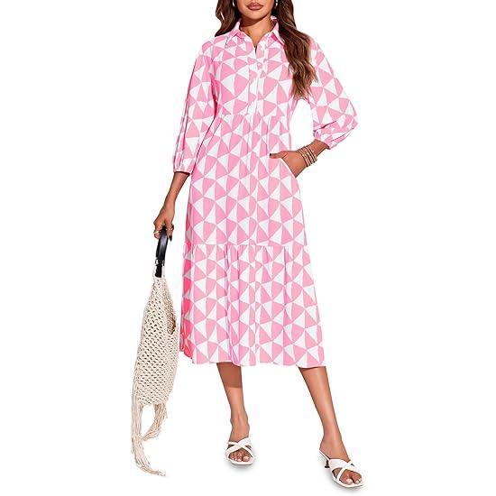 5. Wenrine Womens Boho Midi Dress Long Sleeve Casual Color Block Beach Button Down Shirt Dress