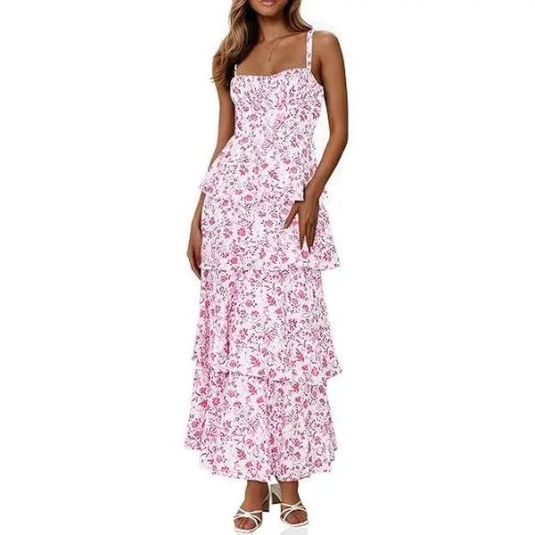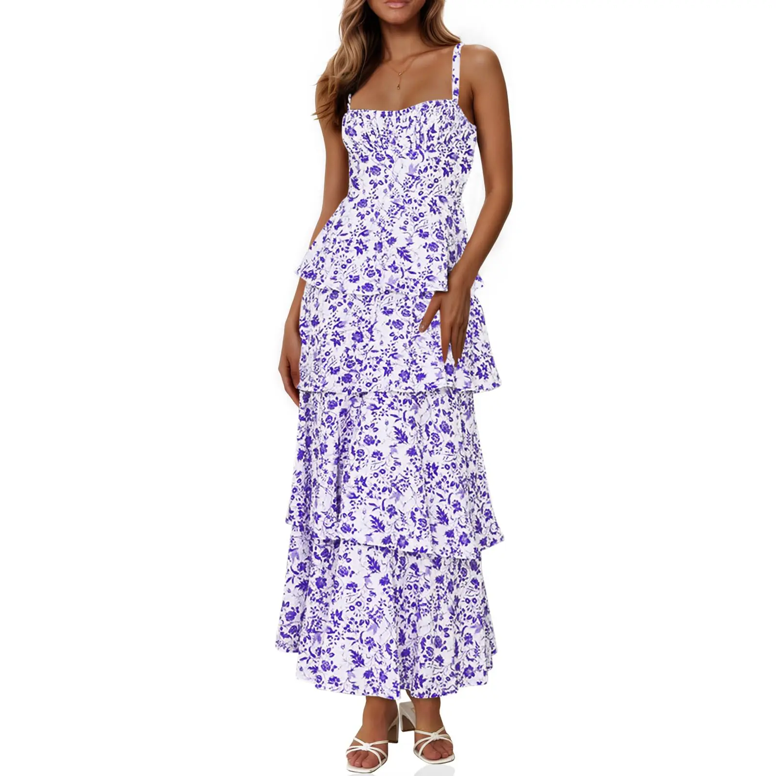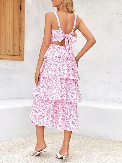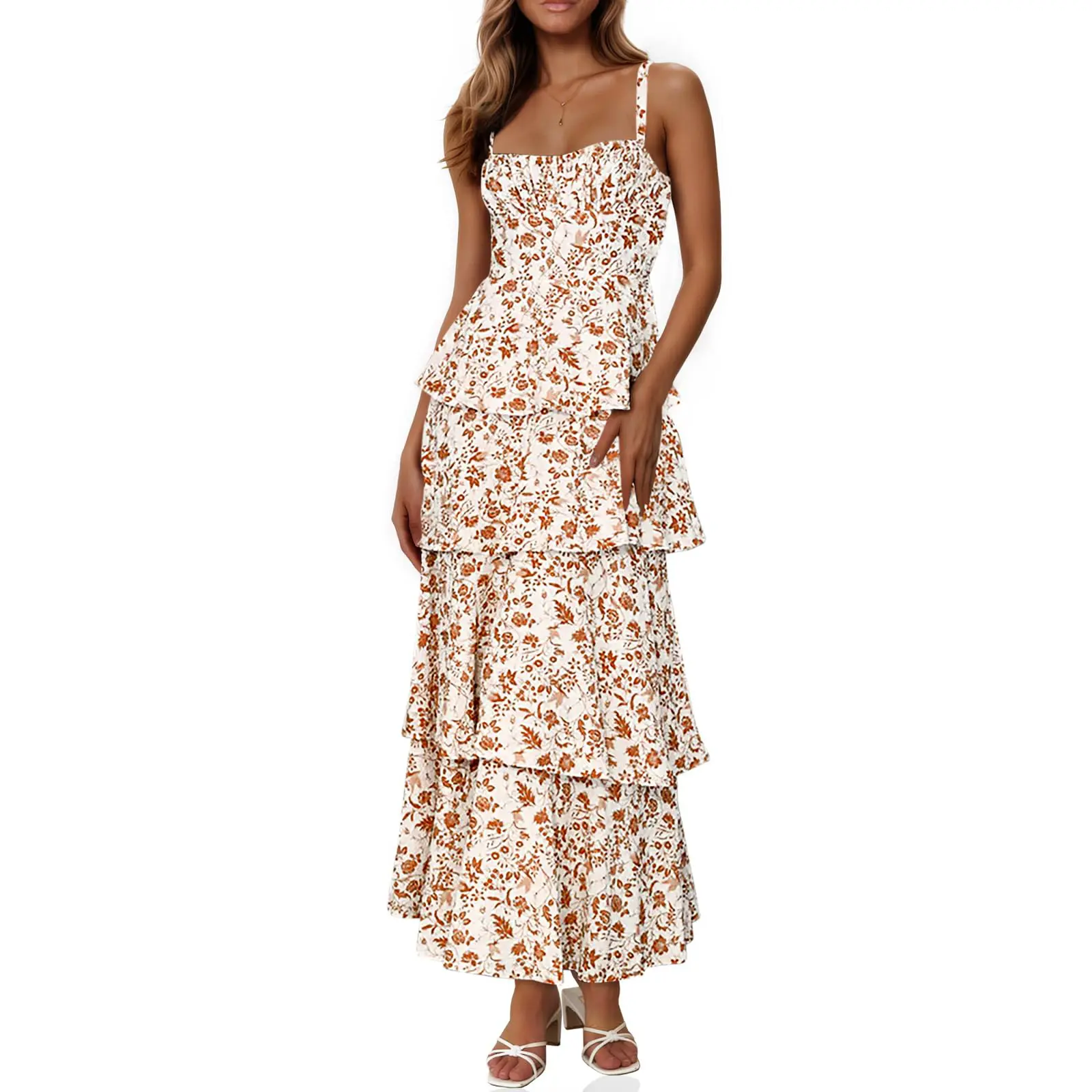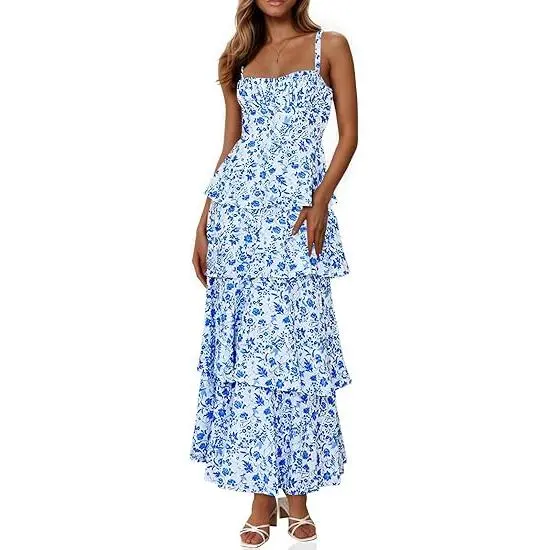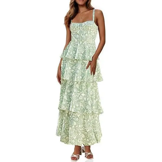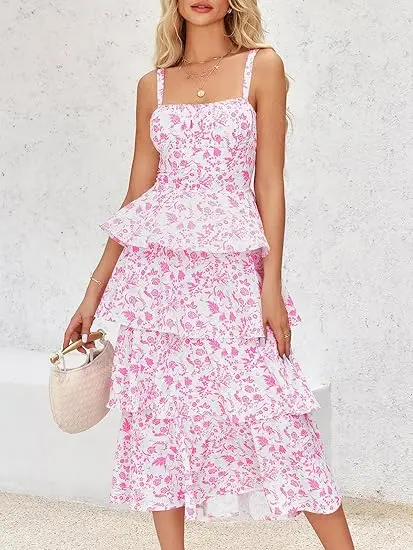 The vibrant floral pattern on the dress infuses it with bursts of energy and color, reminiscent of blooming gardens and sunny days. With tiered ruffles flowing gracefully down the hemline, the dress exudes a classically whimsical and ethereal vibe, adding movement and dimension to the silhouette. The combination of a floral pattern and tiered ruffle embellishments creates a visually captivating combination that is both playful and elegant.