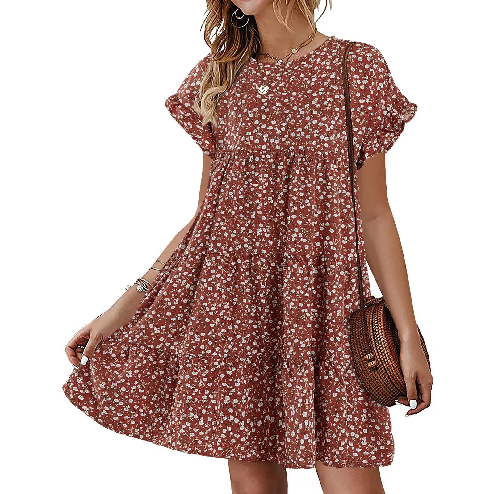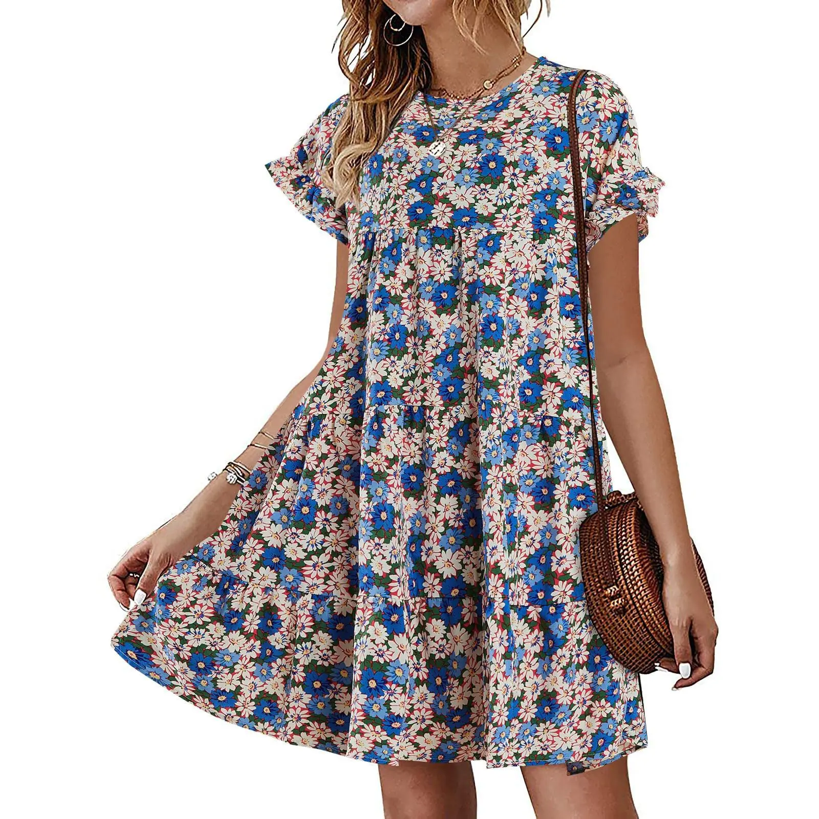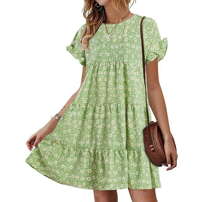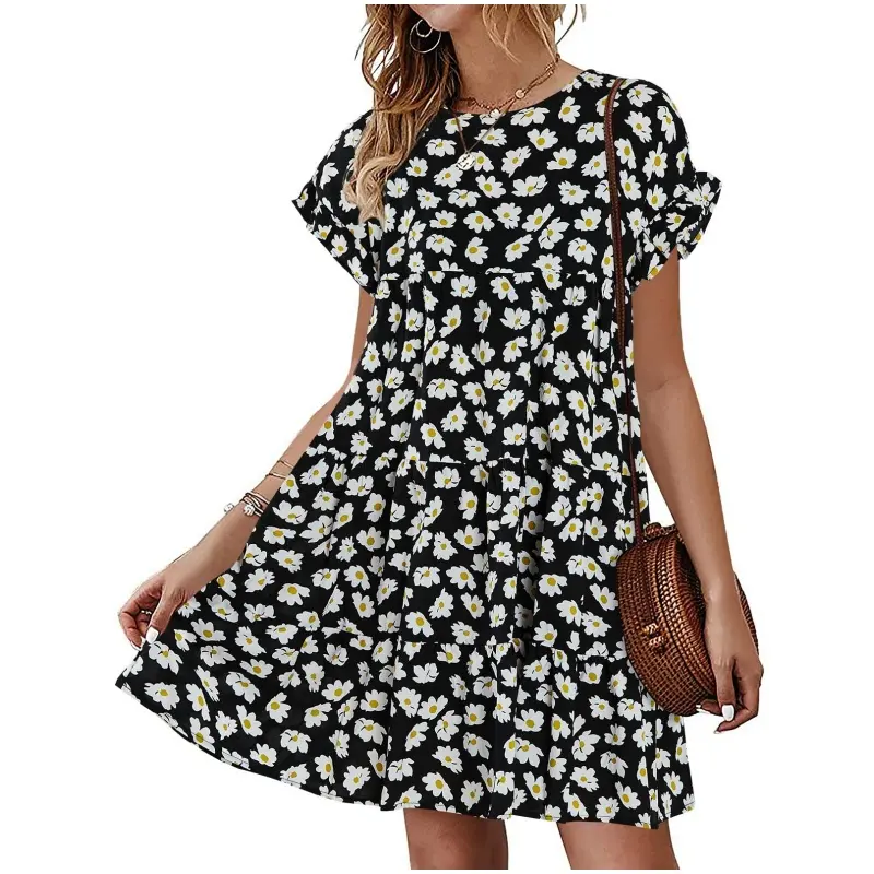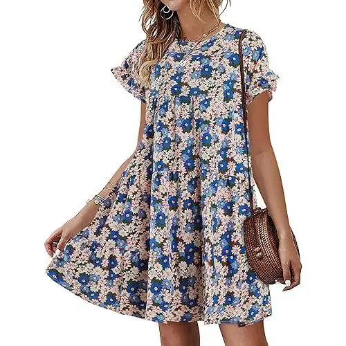 Feature: Floral Printed, Polka Dots, High Ruffle Neckline, Short Sleeve, Crew Neck, Ruffle Hem, Loose Short Mini Tunic Dress For Womens.