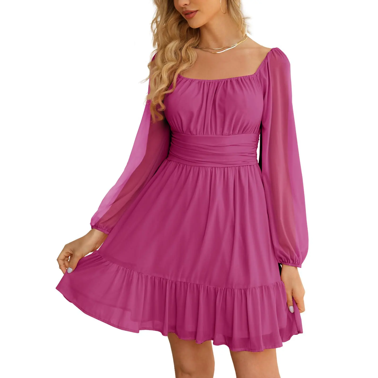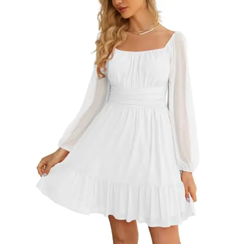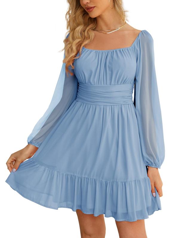 Elevate your style with the Wenrine Women's Mesh Long Sleeve Square Neck Dress. Perfect for Valentine's Day, this high-waist A-line dress features a ruffle hem and flowy design. Ideal for parties, clubs, and casual outings. The dress is versatile for various occasions, including summer short dress, fashion high waist dress, and party club dress.