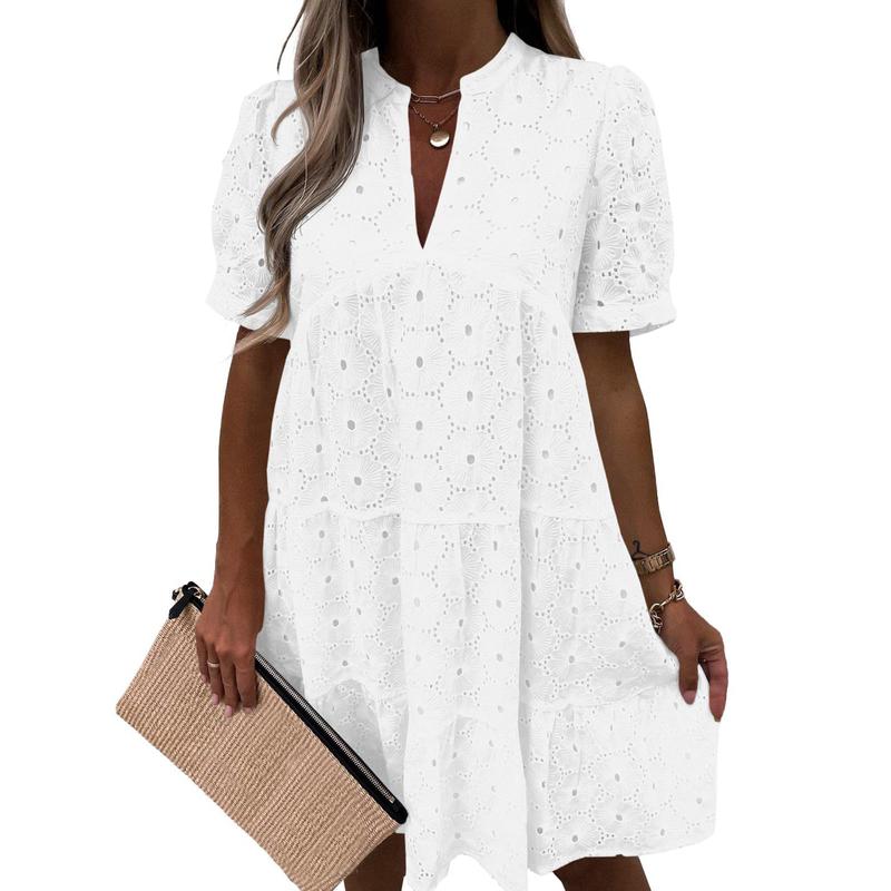 Features: Cute lace dress with short sleeve, v neckline, flowy casual style, trendy summer dresses for wommen
