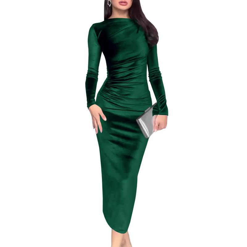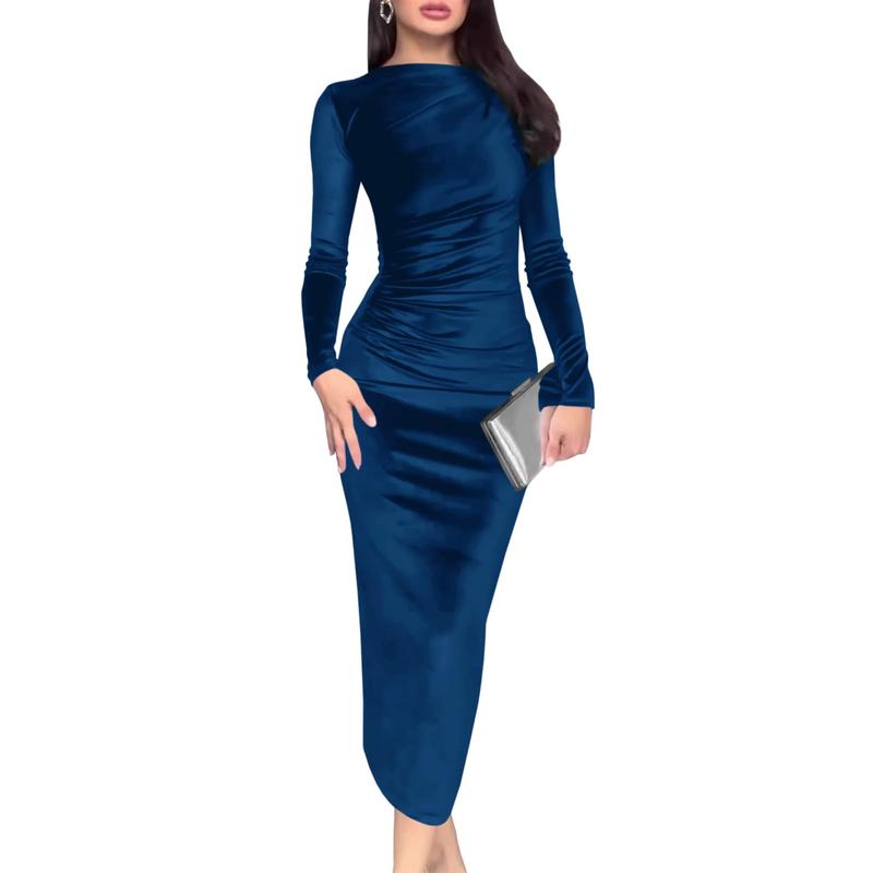 Features: Velvet, bodycon, long sleeve, side ruched, back zipper, solid color, midi dress. Elegant and fashionable party dress.