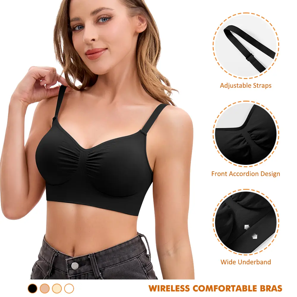 ·Full Coverage Without WiresExperience gentle support and complete coverage in a flexible wire-free design. The front ruched detail adds subtle dimension for a naturally rounded silhouette.