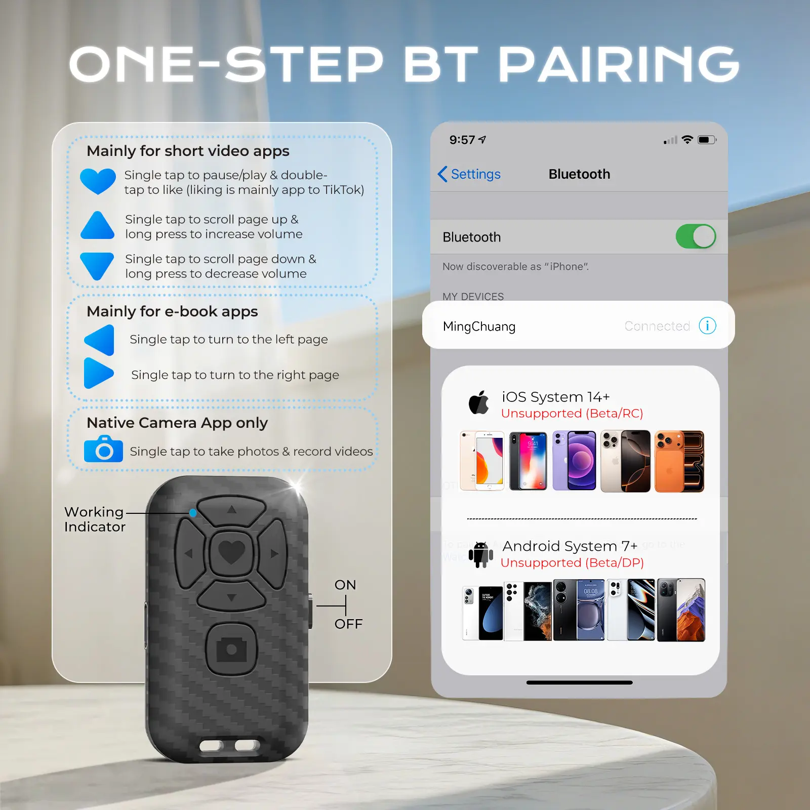 ·【Broad Compatibility】The included remote control is widely compatible with both iPhone (iOS 14+) and Android phones (Android 7+). It pairs easily and maintains a stable connection, offering up to 7 days of battery life - no more worries about frequent charging. It also functions as a camera shutter remote, allowing you to capture photos or videos using your native camera app, freezing every beautiful moment with ease.