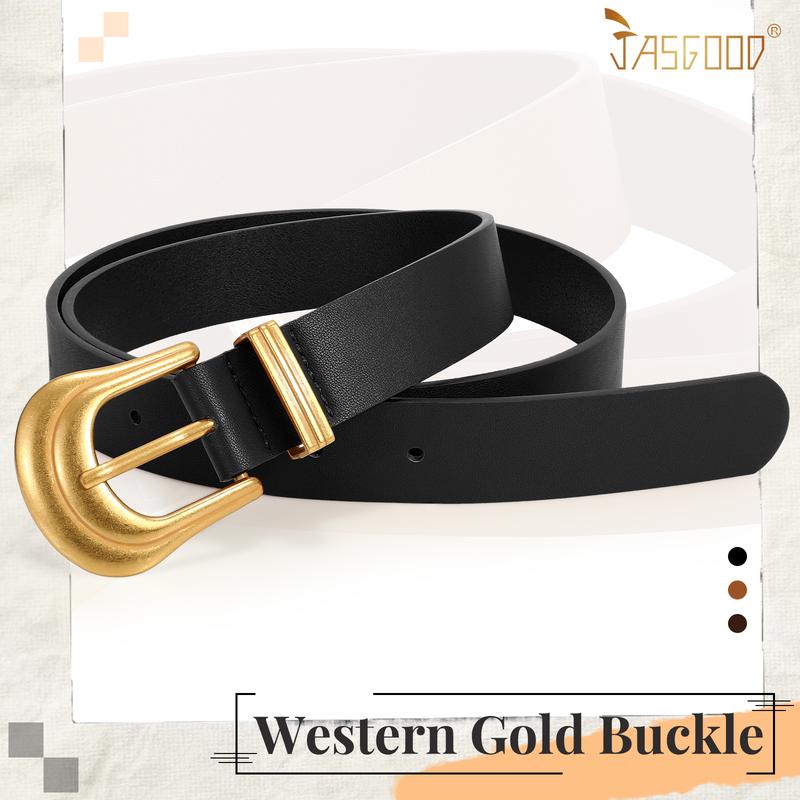 JASGOOD Women's Western Belt Vintage Black Leather Waist Belt with Gold Buckle for Pants Jeans