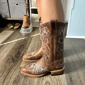 Full-grain leather. 12" shaft height. Broad square toe and stockman heel. Leather lining. Cushioned footbed. Vintage brown leather with allover floral embroidery. Leather outsole. Wide width (CW) sizes feature elastic gore for wide calf fit only. Handcrafted by highly skilled boot artisans. Double-stitched welt construction.