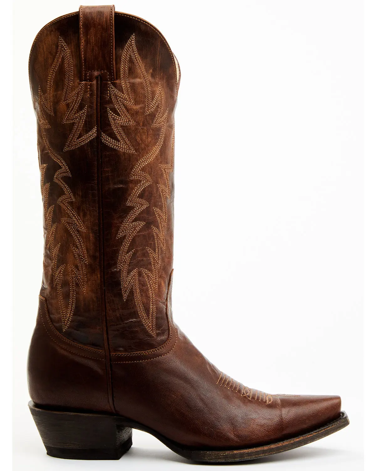 Full-grain leather. 13" shaft height with 14" shaft circumference. Snip toe. Stitched wing pattern shaft design. Side pull-tabs. 1.75" western heel. 3/4 welt construction. Imported. Hybrid leather and TPU outsole. Brass brown leather design.