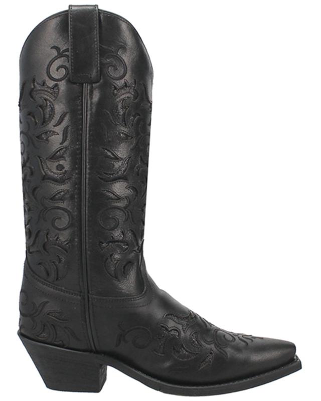 Genuine leather. Snip toe. Pull on style. Solid black design. Filigree embroidery and inlay designs throughout. Snip toe. Synthetic outsole. Imported. 2.25" western heel. 12" shaft height with 14" shaft circumference.