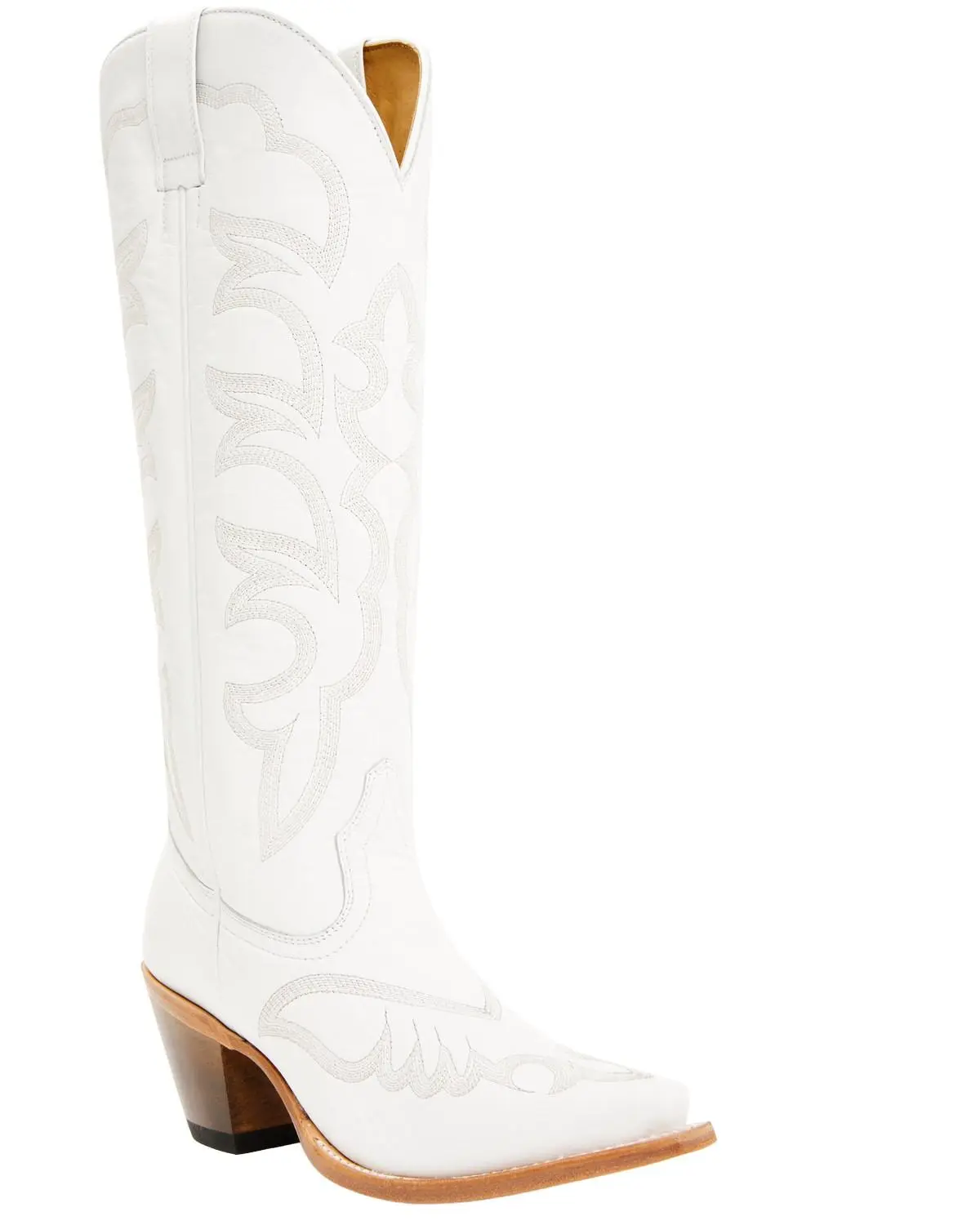 Snip toe. Pull tabs. Leather upper. 15" shaft height. Western heel. Handcrafted by highly skilled boot artisans. Imported. Solid white design with western stitching throughout. Leather outsole with rubber heel cap. Single-stitched welt.