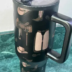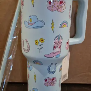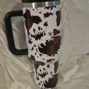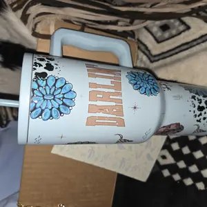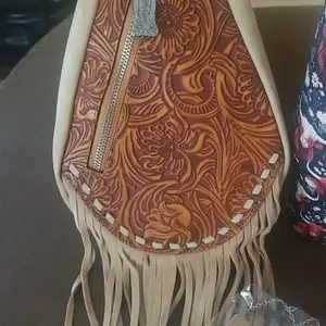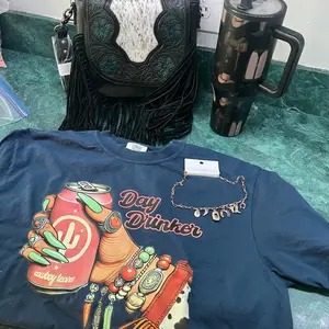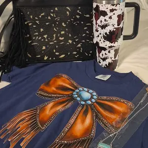 Material: Leather bag with fringe, shirts are made out of better quality tees. Tumblers are more beautiful than Stanleys.