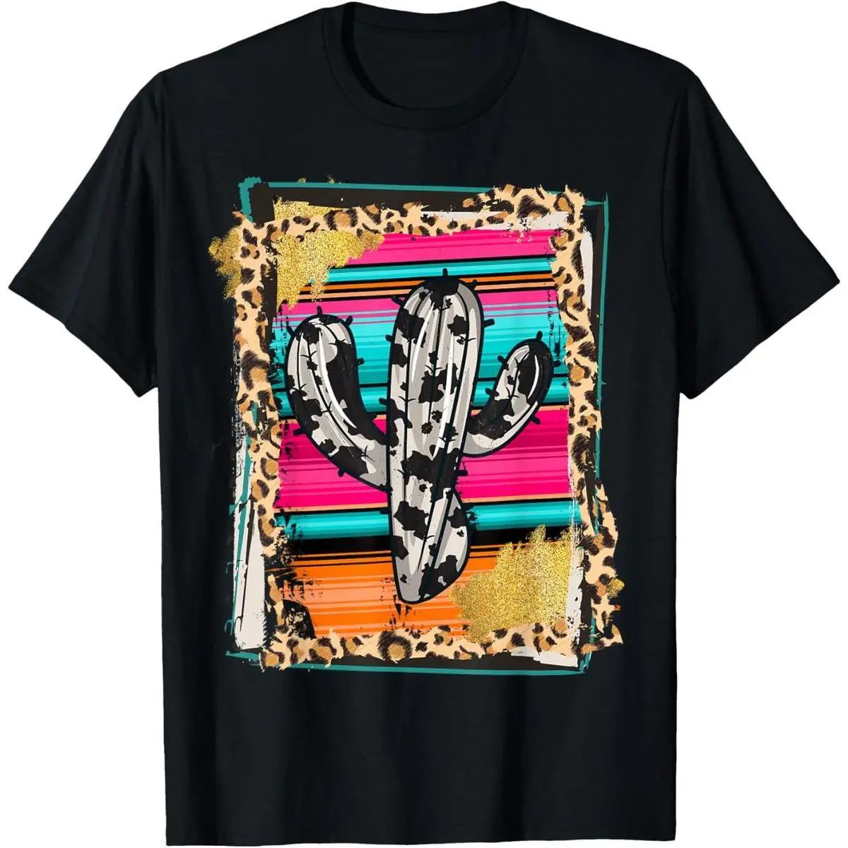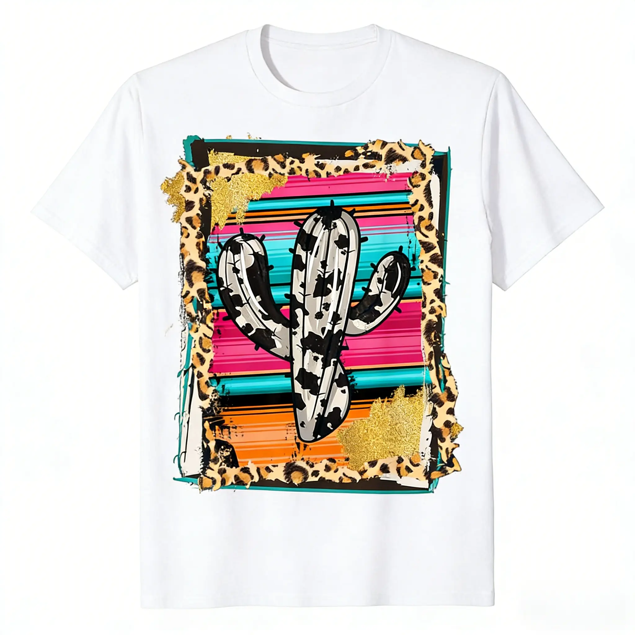 Elevate your casual wardrobe with this eye-catching Western-inspired t-shirt!Featuring a bold cactus graphic set against vibrant serape stripes, framed by trendy leopard print and glittering gold accents, this tee is perfect for the modern cowgirl or boho fashion lover.Made from soft, breathable fabric, it offers all-day comfort while making a statement.Whether you're hitting the rodeo, a country music festival, or just running errands, this unique design will turn heads and showcase your bold, free-spirited style.