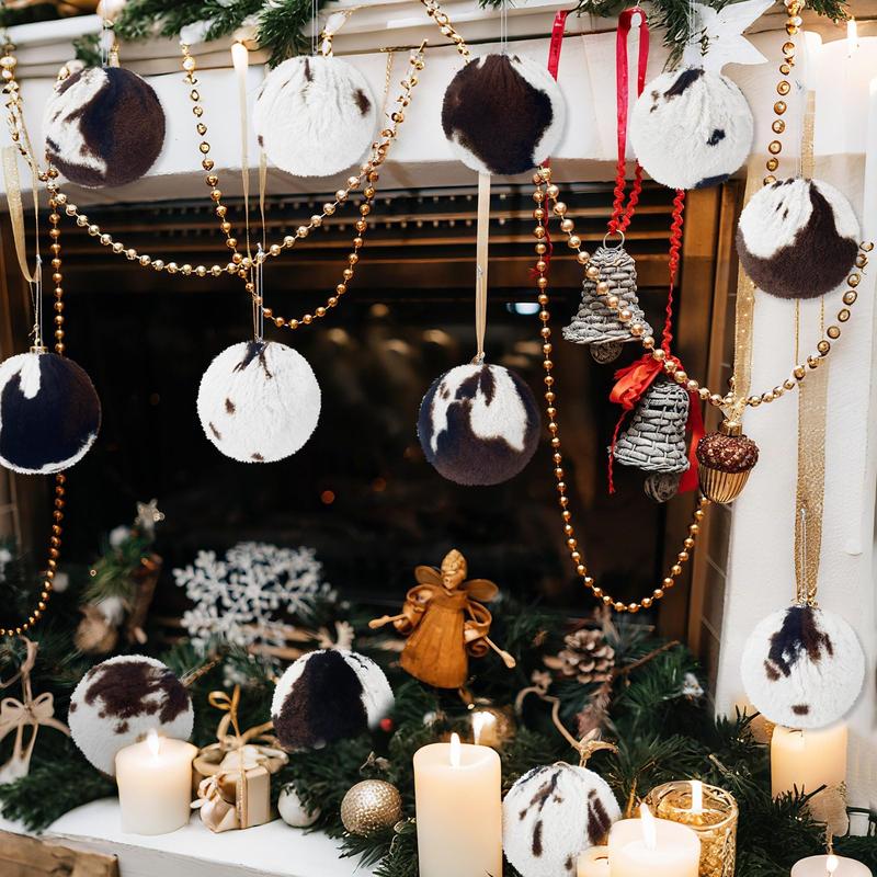 12 Pcs Plush Cowhide Printed Ball Set, 3.15 inches/8 cm, these cow print Christmas balls ornament made of soft faux cowhide and foam, equipped with a hanging ring; The cut of the fabric determines that the cowhide pattern on each Christmas plush ball is different; Unique and lightweight faux cowhide fur balls, more suitable for Christmas parties, western parties and wedding parties or give them as fun gifts to loved ones who love cows or have farm relatives, neighbors and colleagues.
