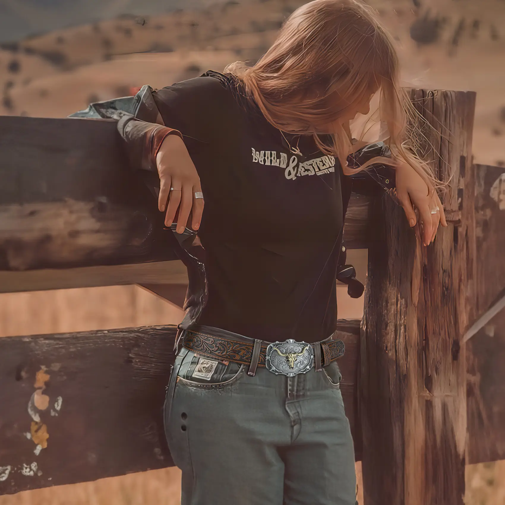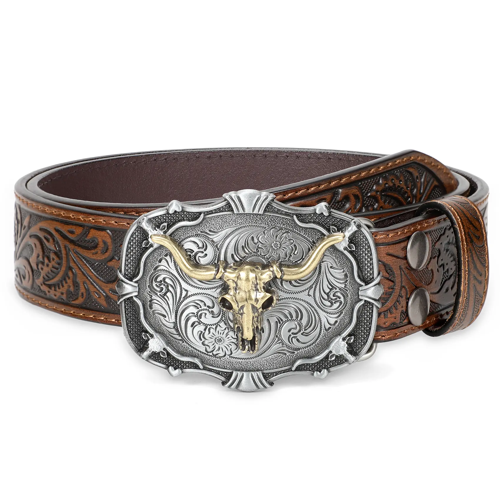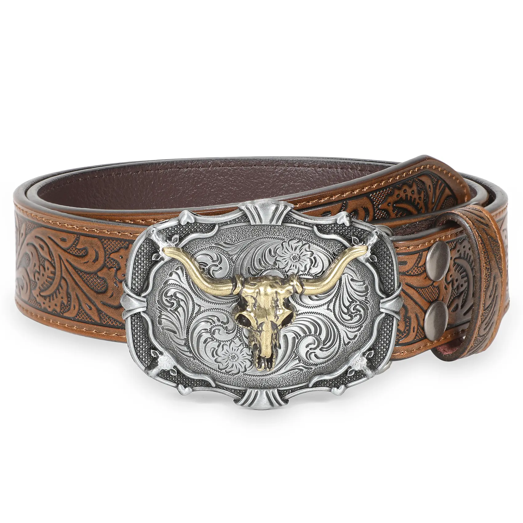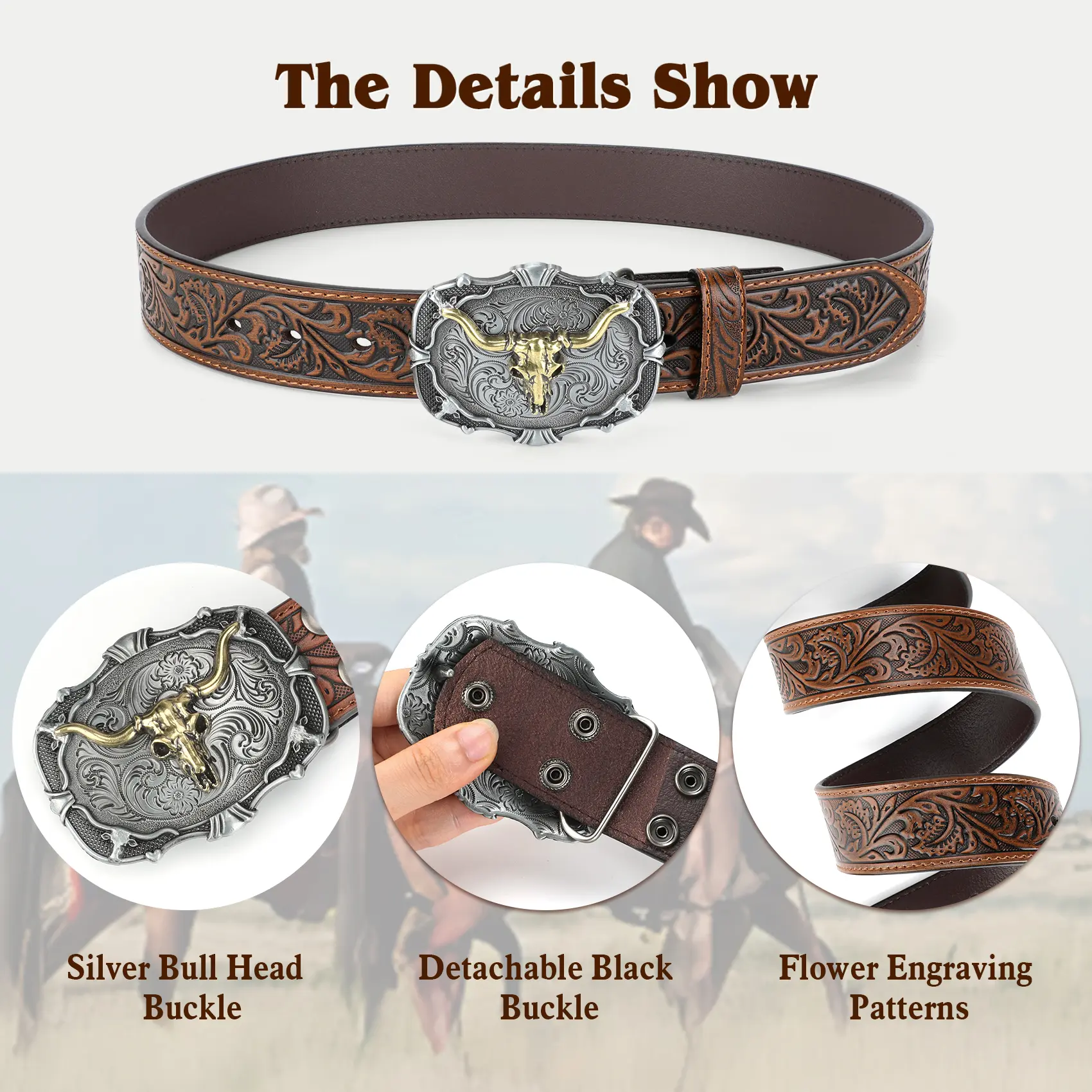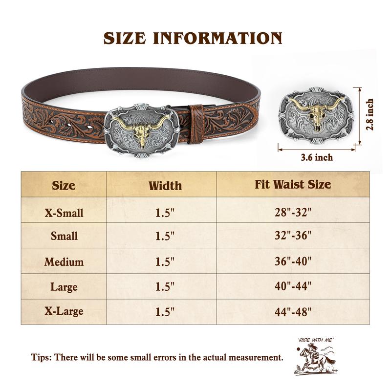 Removable Alloy Buckle: Snap system for interchanging buckles making it for anyone everyday use and different occasions: a country concert, cowboy theme birthday gathering, rodeo etc. Embossed cowboy belt leather fits through regular 1.5" wide belt loops on jeans.