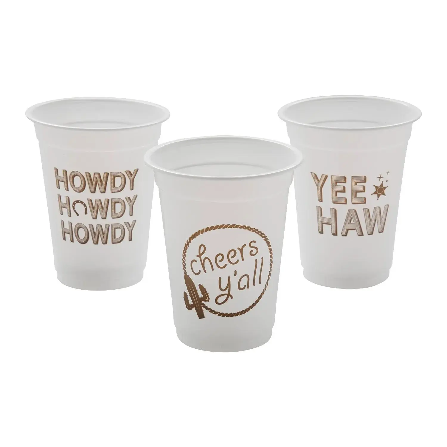Partygoers are sure to say "Yee-Haw" with these western-themed plastic cups in hand! Printed with a variety of classic cowboy sayings, this bulk supply of disposable cups is a great option for serving up drinks at a cowboy-themed birthday party, classroom event or other celebratory outing. Browse our site for more matching tableware and decorations to put the finishing touch on your party! © OTCbr