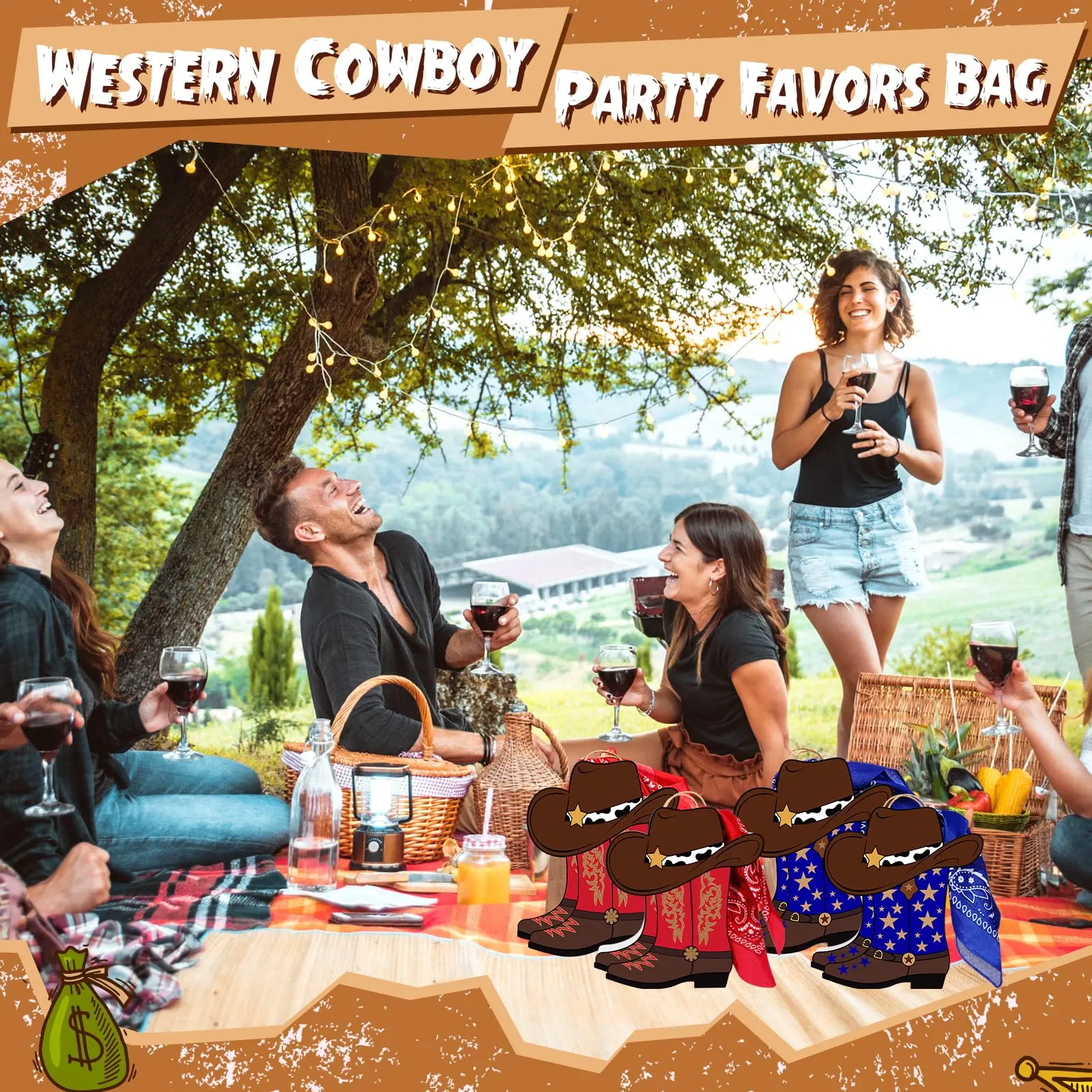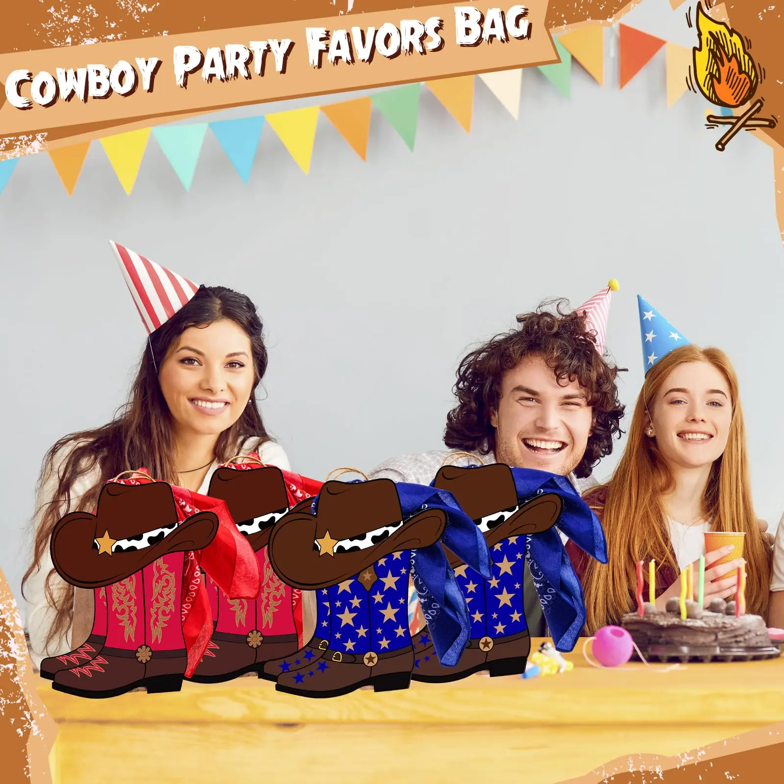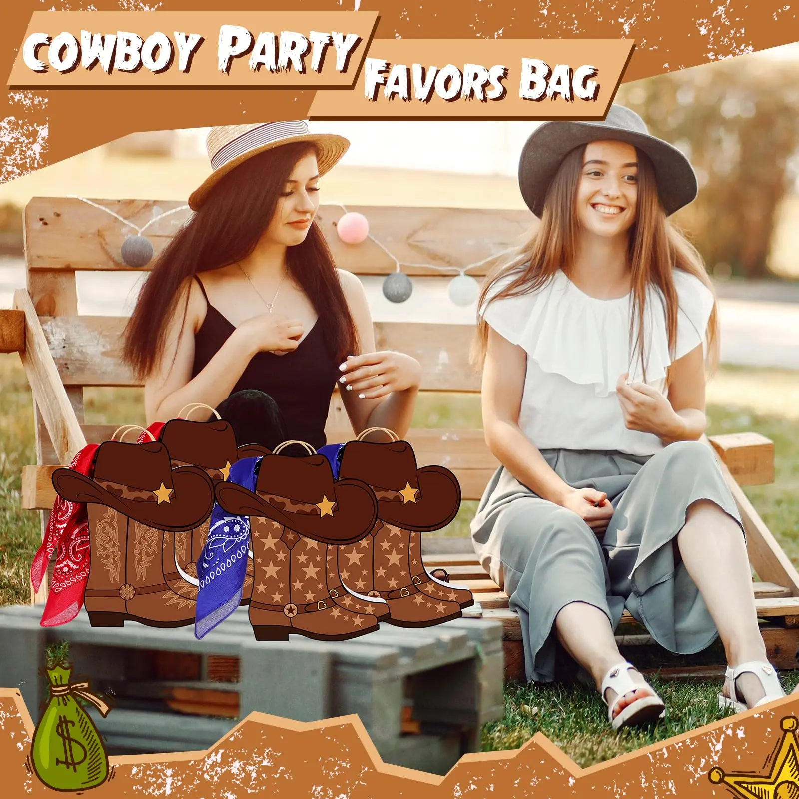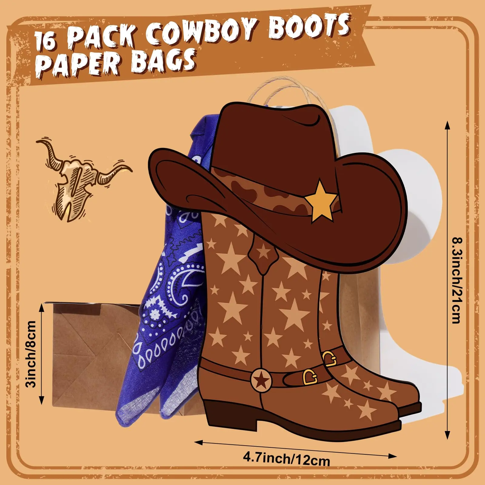 The western cowboy boot paper goodie bags are constructed from quality kraft paper and have a sealed bottom that makesthem suitable for use as party favor bags to store treats and presents; The soft polyester applied to make the paisley bandanas is not only dependable but also distinctive, making them ideal for incorporating a sense of color into a variety of ensembles or decorations.