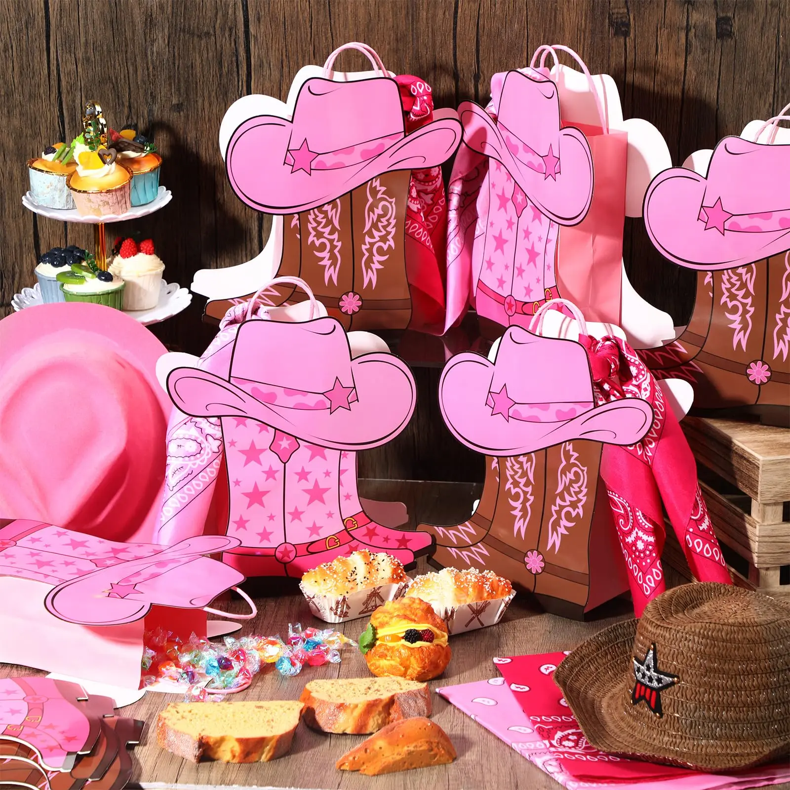 Package 2:pink western cowgirl boots gift paper bags and cotton paisley bandanas in rose pink and light pink; Cowboy boots come in two styles and colors, with pink hats.