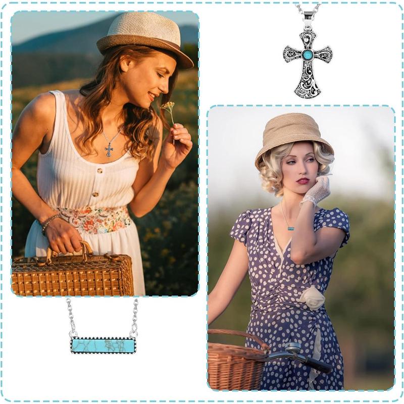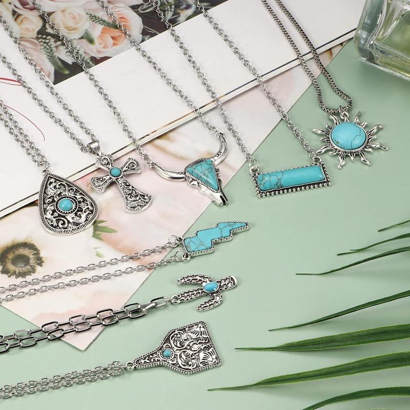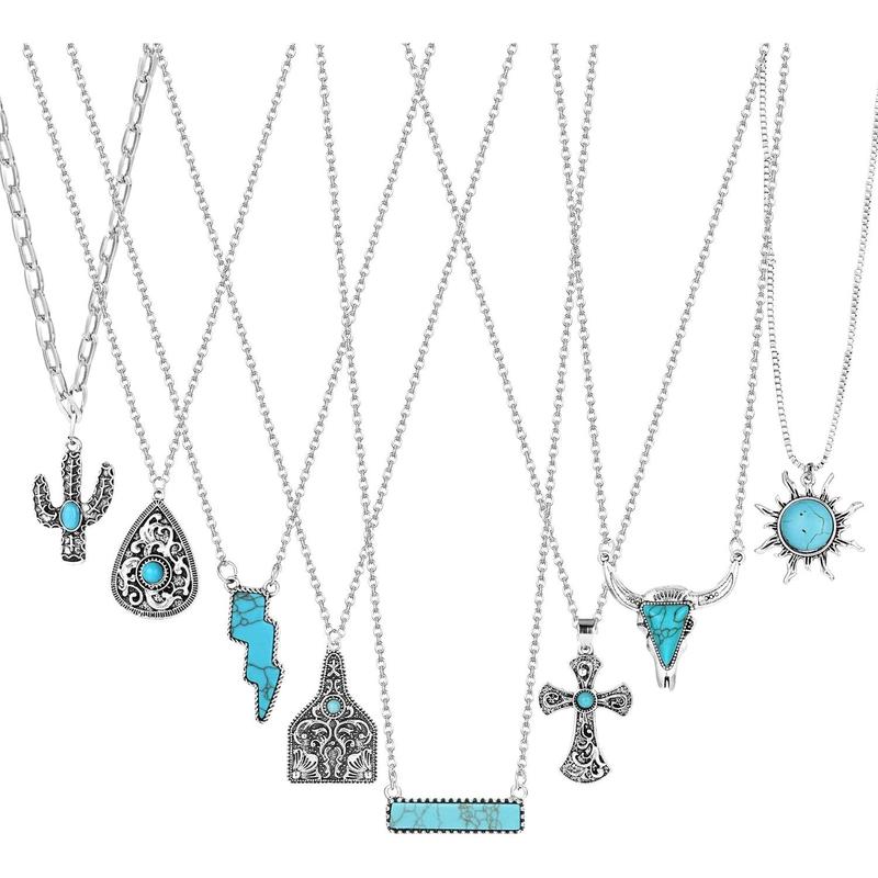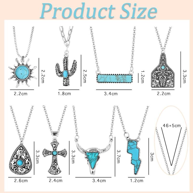 ·Variety of Styles: Each order includes 8 unique western turquoise necklaces, including sun, cross, cactus, lightning bolt, bar, cow tag, and bull skull necklaces.