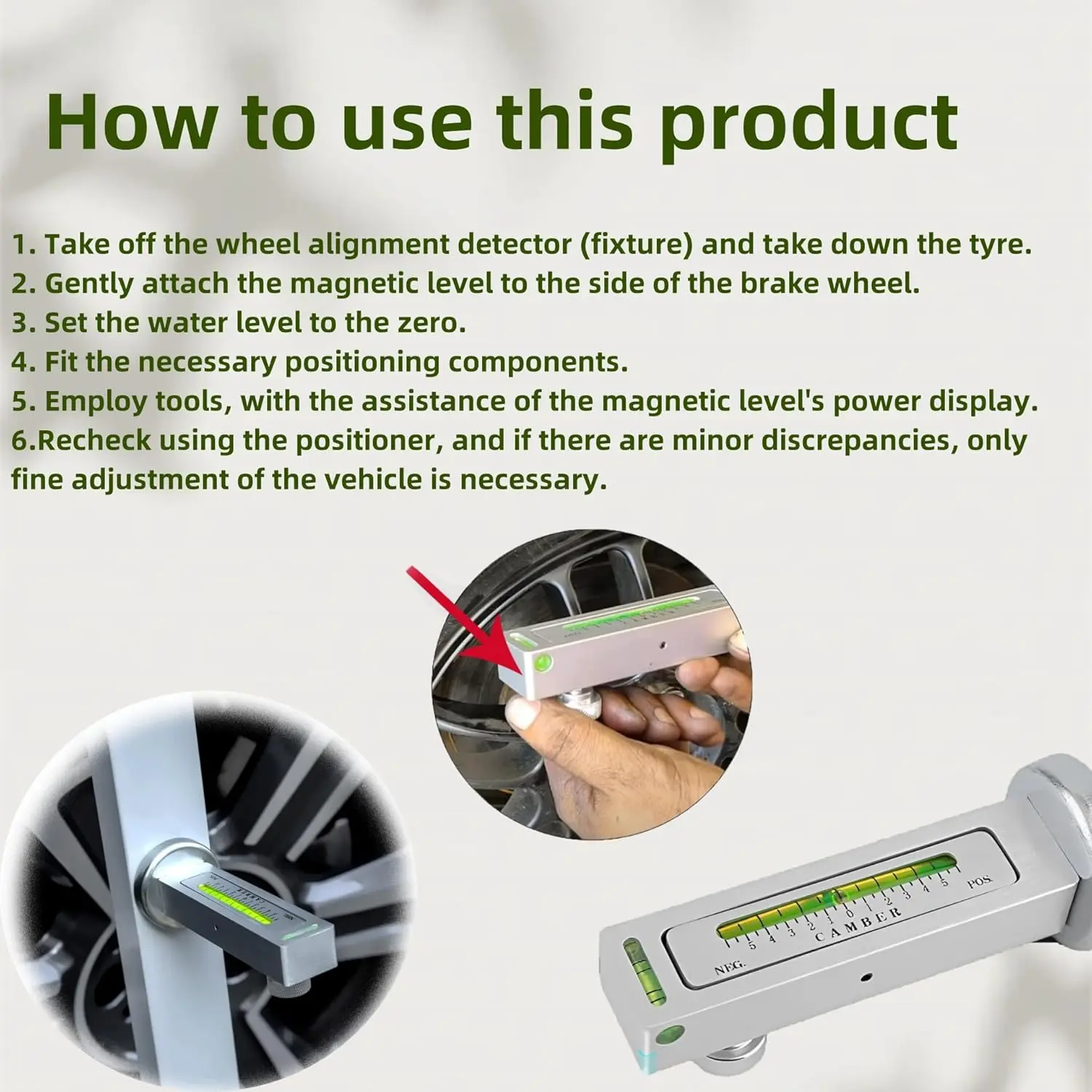 Main Characteristics: Our wheel alignment tool is capable of assisting you in resetting the strut to its initial camber position after the suspension has been removed and reinstalled.It can also check the extent of camber variation prior to re-installation.This camber alignment tool is ideal for precisely inspecting the castor and camber angles.