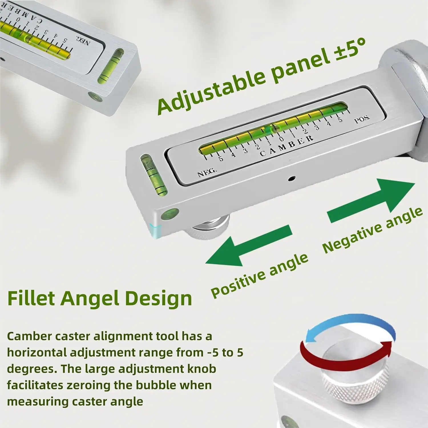 Expert-Level Measurement: The camber and caster alignment tool boasts a horizontal adjustment span of -5 to 5 degrees.Its oversized adjustment knob makes it easy to zero out the bubble during caster angle measurements.