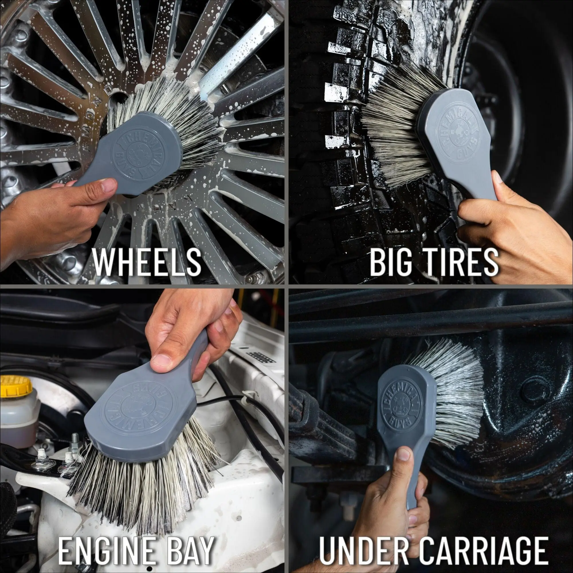 The medium-duty bristles easily lift grease, oil, and road grime from wheels, undercarriages, and engine bays. Its plush flagged-tip bristles cover more area and provide a gentle touch—tough on dirt but safe on surfaces, even delicate finishes and plastic components.